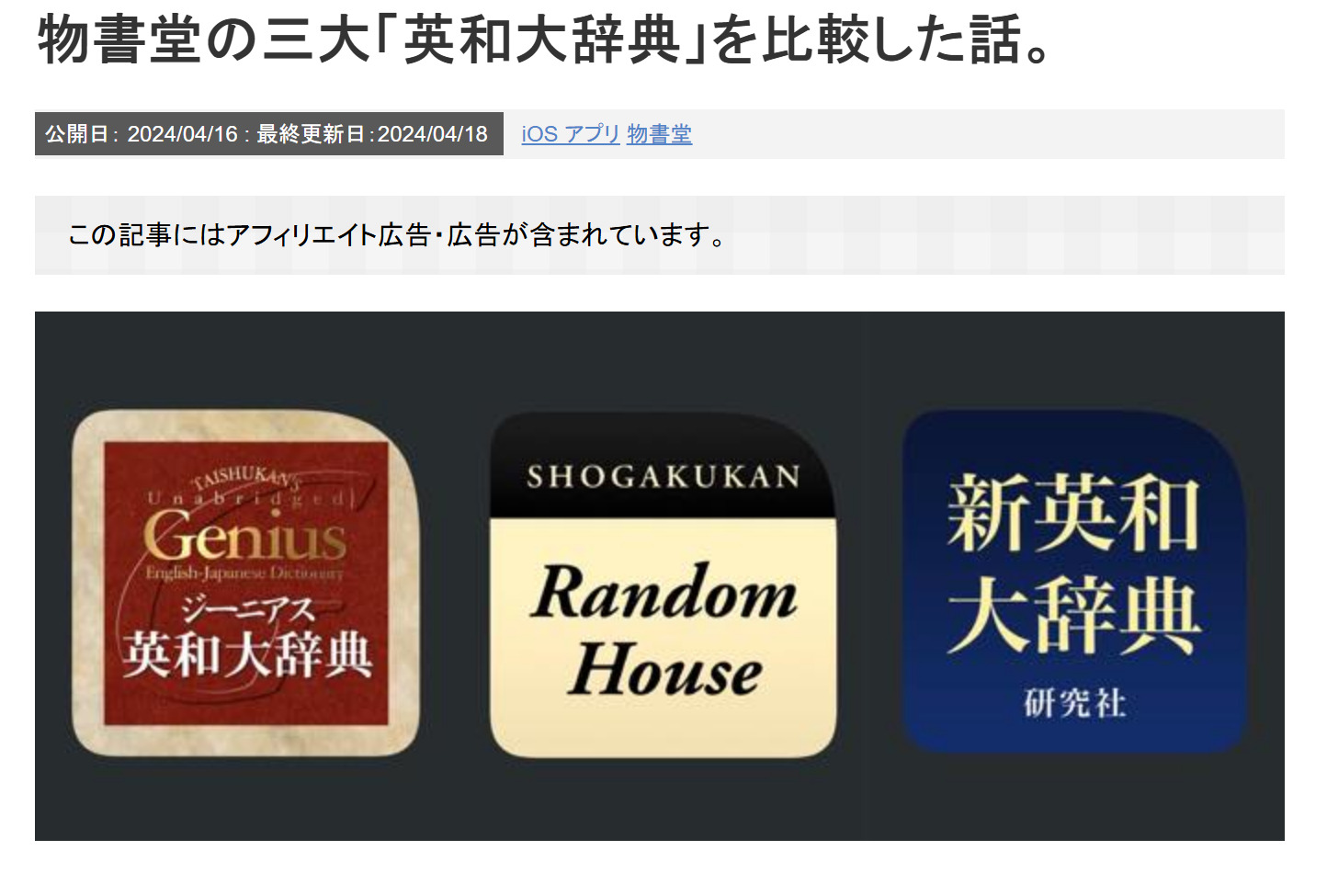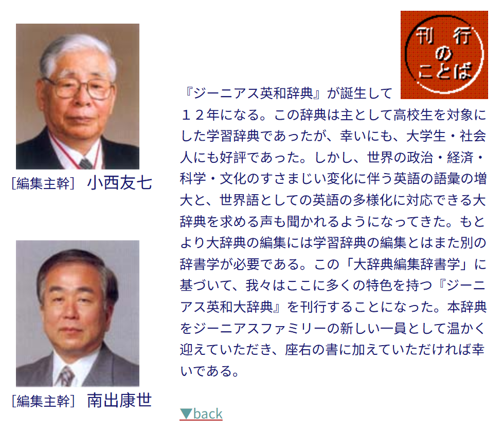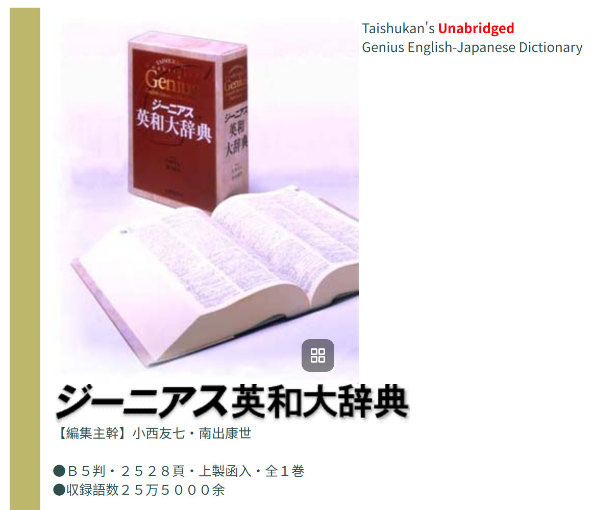 【ジーニアス英和大辞典】,三大英和辞典之一,主编小西友七,收词25.5万。我开始使用它,是在casio的电子词典上;它长期是7300中国语机型的英和词典标准配置(7300会同时再配置ジーニアス英和、ジーニアス和英两本中型词典),给我的使用感觉有点像小型版的兰登英和。