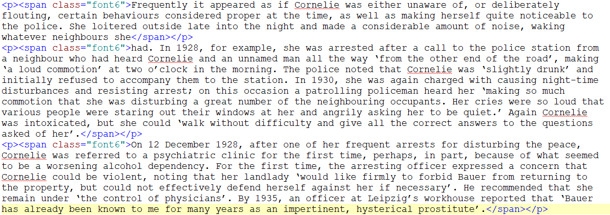 把控制碼刪除,以一個空格代替,就可以除掉斷行而不造成拼寫錯誤。但得設定條件,否則會把應當斷行的部份也錯殺,造成全書都擠成一段的亂象。目前發現不該斷行的起點,都是以外語的小寫為結尾的單字,如此處的she字的e; 另外逗號, 也常出現錯斷。