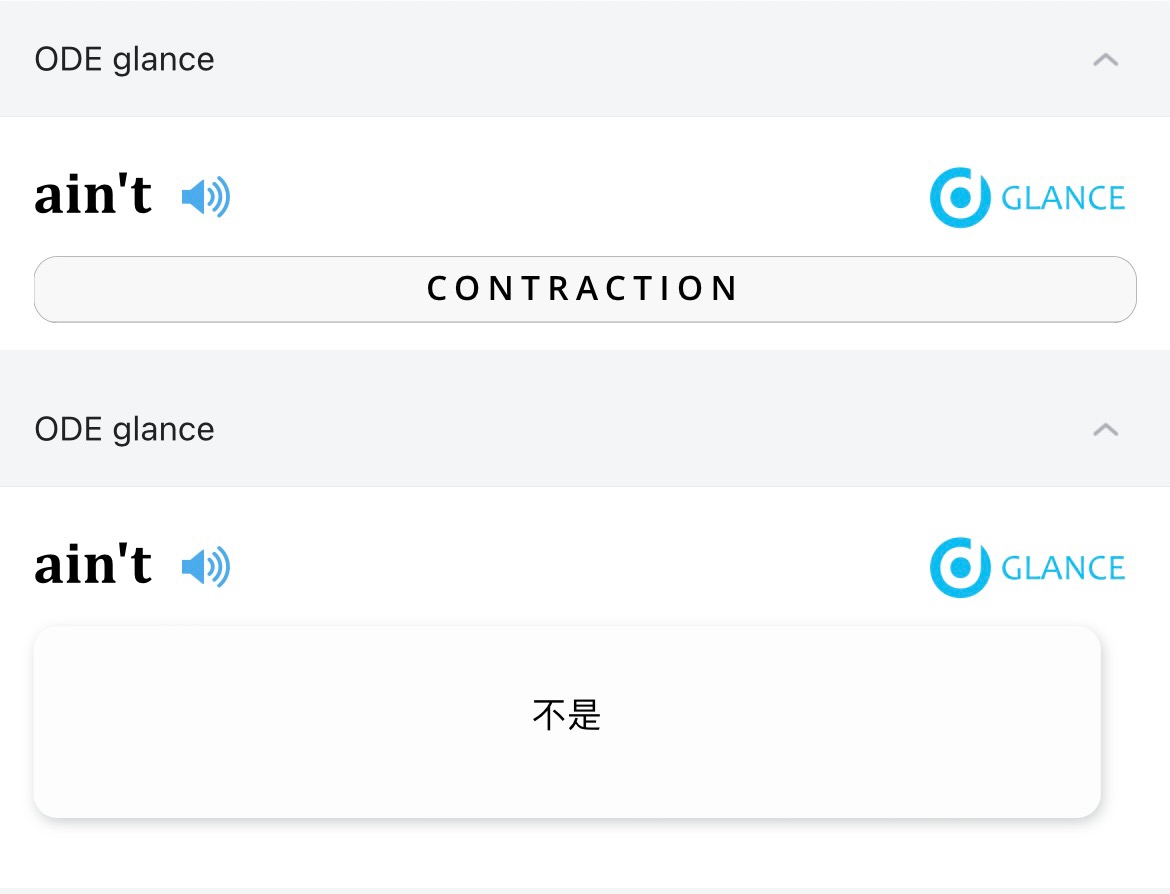 - 与OALD 2023.03 英汉双解词库放在一组时,词源展不开,卡片和GLANCE能展开,不显示发音按钮。