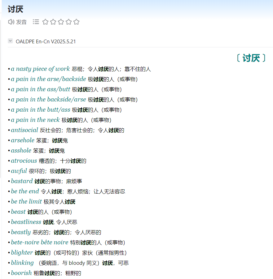 随便查一个中文字、词,它能匹配出少则几十、多则几百条中翻英,都是些牵强附会的简单关键字匹配,就是某个英文单词、短语的中文翻译里面有这个查询的中文、字词,它就全部给列出来。