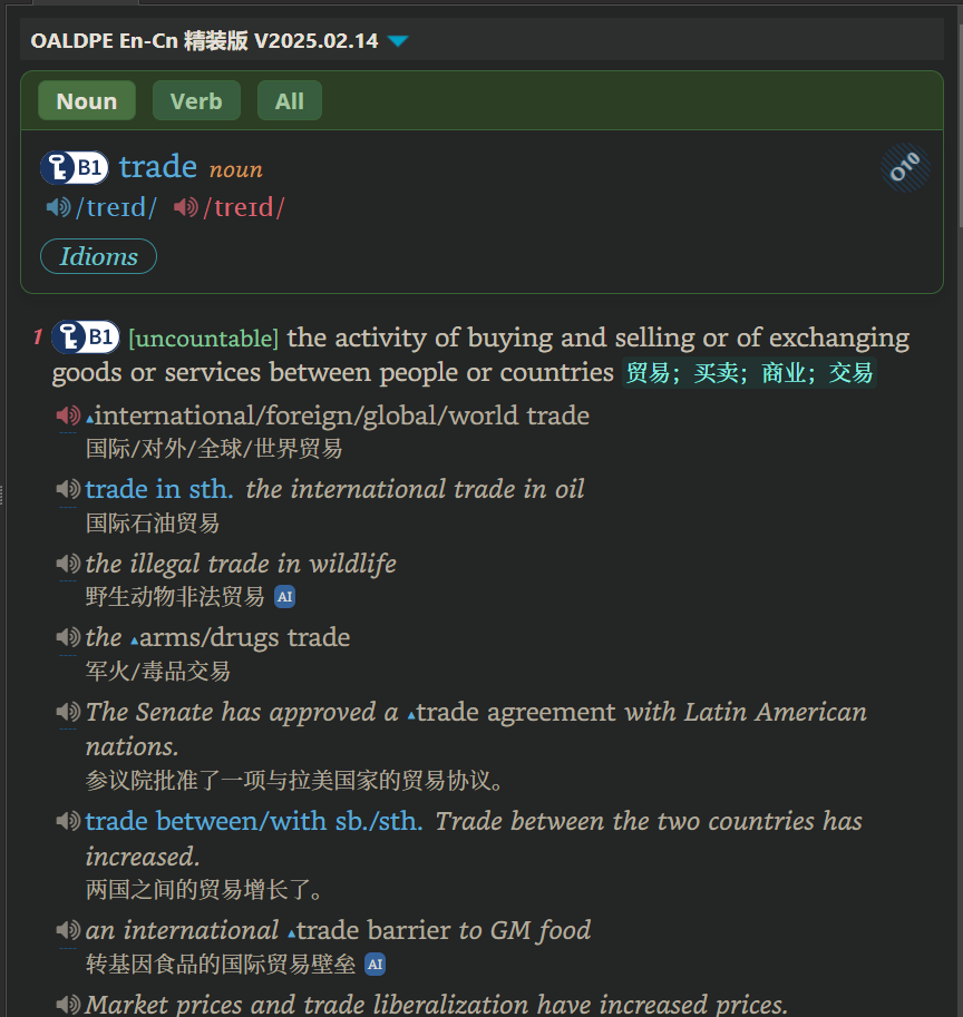 我习惯用夜晚或者黑色背景主题。但当我用这种主题时,部分英文解释,就是英文解释单词的白字部分会很浅,导致我看不清。我觉得可能需要修改css样式来解决。但我计算机前端专业知识有限,无法锁定这一特定部分更改。因为只有这一部分有问题,其他部分的词典页面样式,无论大小,字体,颜色等都无问题。我怕全局修改或者修改不到位,也会影响其它部分。如下图划线部分。