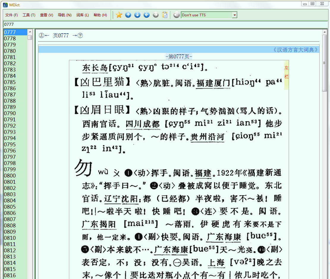 感谢 sxingbai和shaoshi两位仁兄的制作。本人属于这样的情况,想在GD词典库中有一部方言词典,因为有时读书时遇到一些方言词确实想了解其意,这部词典非常方便。但我对于读音没有兴趣,也不想研究方言,所以不想加入体量那么大的图片文件。因而改造了两位发布的两部词典,将其合为一个,删掉了所有图片的连接,显示出来是这样的: