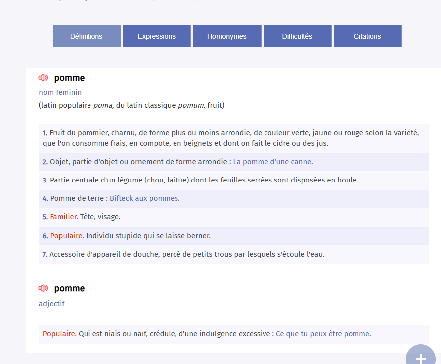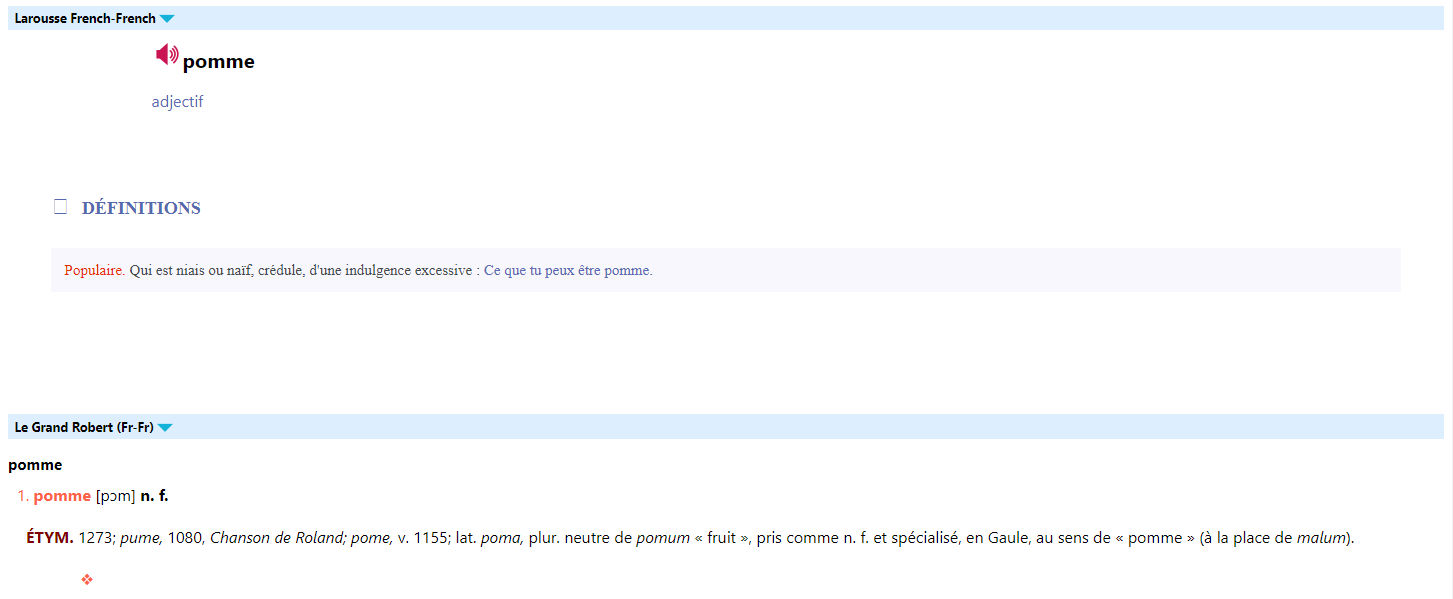 Thank you so much, I got it. Could you tell me, do you have full “pomme” article in Larousse Fr-Fr? I have only adjective whereas online version shows everything, as it should be. (upper Golden Dict, lower Larousse website)