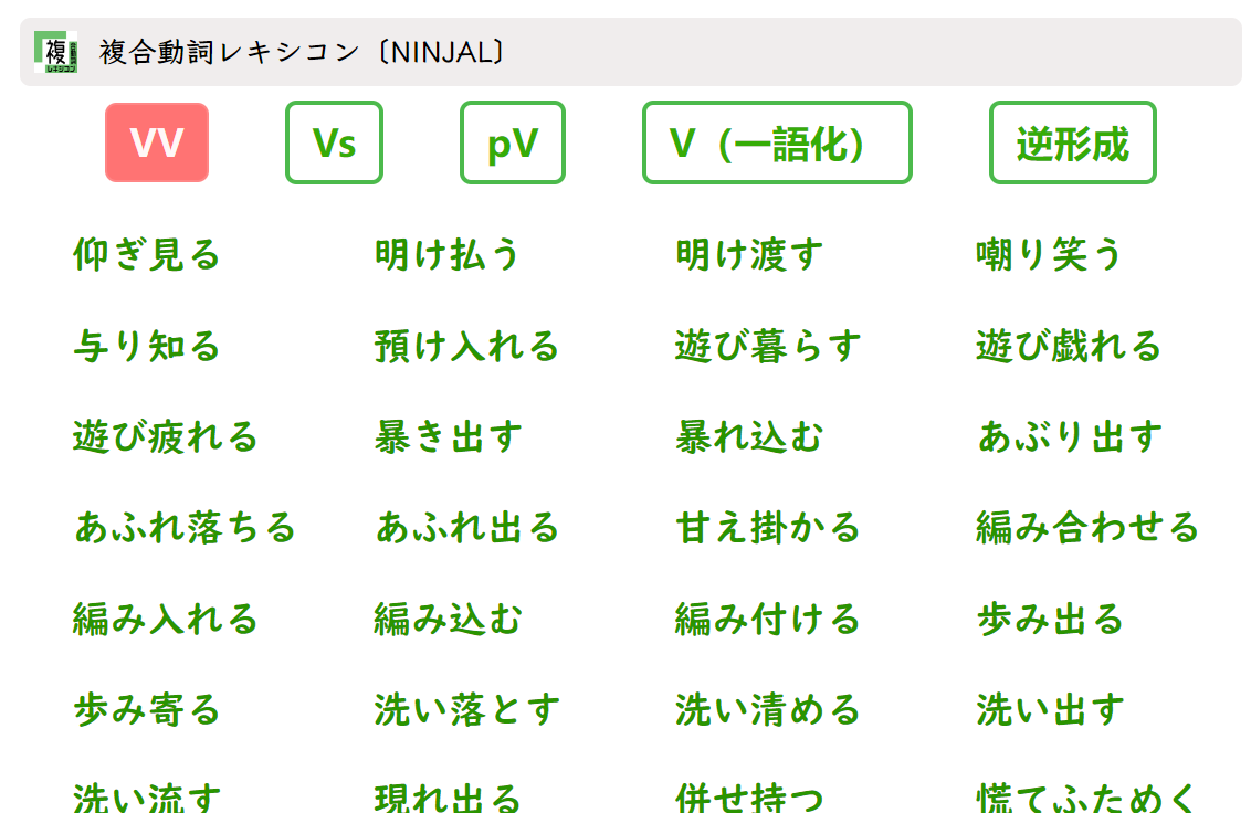 複合vv或者複合VV,可以查到所有「語構造」为VV的複合動詞 - 也可以词条内点击語構造的地方