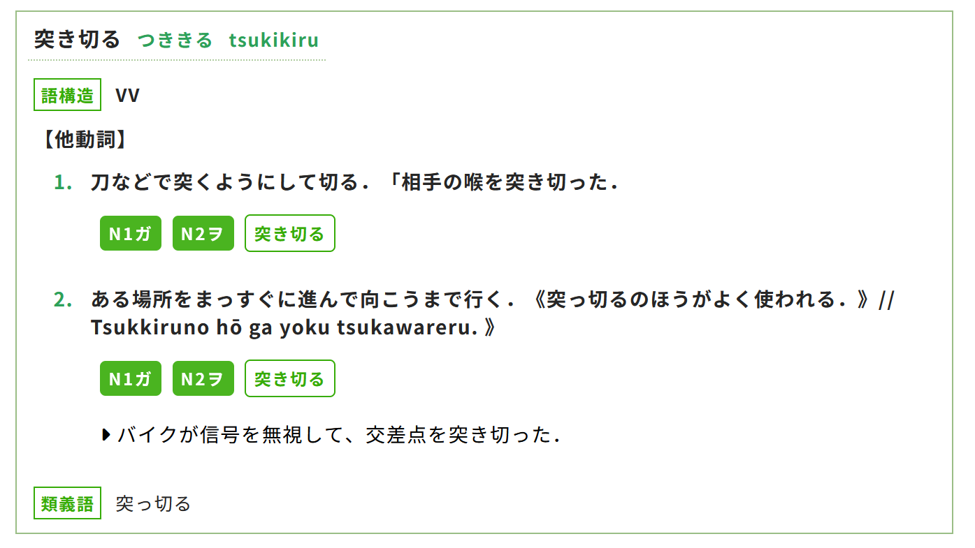 - 有两个词里面,含义解释后面带有位置出错的注释;以及「突き切る」这个词的第一个意思的例句似乎错位了