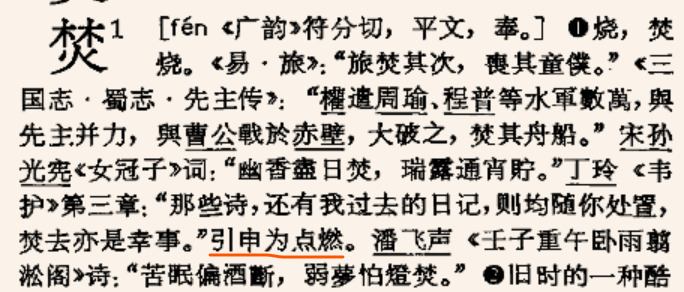 “ParaphraseList”: [{“Paraphrase”: [{“type”:“text”,“text”:“烧。”,“node_id”:“4hmlr9v8raf4nn”}], “ParaphraseList”: [{“Sentence”: [{“type”:“text”,“text”:“旅焚其次,”,“node_id”:“”},{“type”:“text”,“attrs”:{“simplified_text”:“丧”},“text”:“喪”,“node_id”:“”},{“type”:“text”,“text”:“其童”,“node_id”:“”},{“type”:“text”,“attrs”:{“simplified_text”:“仆”},“text”:“僕”,“node_id”:“”},{“type”:“text”,“text”:“。”,“node_id”:“”}], “Work”: [{“type”:“text”,“text”:“《易·旅》”,“node_id”:“”}]}, {“Sentence”: [{“type”:“text”,“attrs”:{“simplified_text”:“权”},“text”:“權”,“node_id”:“”},{“type”:“text”,“text”:“遣周瑜、程普等水”,“node_id”:“”},{“type”:“text”,“attrs”:{“simplified_text”:“军数万”},“text”:“軍數萬”,“node_id”:“”},{“type”:“text”,“text”:“,”,“node_id”:“”},{“type”:“text”,“attrs”:{“simplified_text”:“与”},“text”:“與”,“node_id”:“”},{“type”:“text”,“text”:“先主并力,”,“node_id”:“”},{“type”:“text”,“attrs”:{“simplified_text”:“与”},“text”:“與”,“node_id”:“”},{“type”:“text”,“text”:“曹公”,“node_id”:“”},{“type”:“text”,“attrs”:{“simplified_text”:“战于”},“text”:“戰於”,“node_id”:“”},{“type”:“text”,“text”:“赤壁,大破之,焚其舟船。”,“node_id”:“”}], “Work”: [{“type”:“text”,“text”:“《三国志·蜀志·先主传》”,“node_id”:“”}]}, {“Sentence”: [{“type”:“text”,“text”:“幽香”,“node_id”:“”},{“type”:“text”,“attrs”:{“simplified_text”:“尽”},“text”:“盡”,“node_id”:“”},{“type”:“text”,“text”:“日焚,瑞露通宵”,“node_id”:“”},{“type”:“text”,“attrs”:{“simplified_text”:“贮”},“text”:“貯”,“node_id”:“”},{“type”:“text”,“text”:“。”,“node_id”:“”}], “AuthorList”: [[{“type”:“text”,“text”:“孙光宪”,“node_id”:“”}]], “SetInPeriod”: [{“type”:“text”,“text”:“宋”,“node_id”:“”}], “Work”: [{“type”:“text”,“text”:“《女冠子》词”,“node_id”:“”}]}, {“Sentence”: [{“type”:“text”,“text”:“土人自”,“node_id”:“”},{“type”:“text”,“attrs”:{“simplified_text”:“远”},“text”:“遠”,“node_id”:“”},{“type”:“text”,“text”:“投柴”,“node_id”:“”},{“type”:“text”,“attrs”:{“simplified_text”:“积”},“text”:“積”,“node_id”:“”},{“type”:“text”,“text”:“孔上,引火焚之者三。”,“node_id”:“”}], “AuthorList”: [[{“type”:“text”,“text”:“李中馥”,“node_id”:“”}]], “SetInPeriod”: [{“type”:“text”,“text”:“明”,“node_id”:“”}], “Work”: [{“type”:“text”,“text”:“《原李耳载·怪石生蛇》”,“node_id”:“”}]}, {“Sentence”: [{“type”:“text”,“text”:“那些诗,还有我过去的日记,则均随你处置,焚去亦是幸事。”,“node_id”:“”}], “AuthorList”: [[{“type”:“text”,“text”:“丁玲”,“node_id”:“”}]], “Work”: [{“type”:“text”,“text”:“《韦护》第三章”,“node_id”:“”}]}, {“Sentence”: [{“type”:“text”,“text”:“苦眠偏酒”,“node_id”:“”},{“type”:“text”,“attrs”:{“simplified_text”:“断”},“text”:“斷”,“node_id”:“”},{“type”:“text”,“text”:“,弱”,“node_id”:“”},{“type”:“text”,“attrs”:{“simplified_text”:“梦”},“text”:“夢”,“node_id”:“”},{“type”:“text”,“text”:“怕”,“node_id”:“”},{“type”:“text”,“attrs”:{“simplified_text”:“灯”},“text”:“燈”,“node_id”:“”},{“type”:“text”,“text”:“焚。”,“node_id”:“”}], “AuthorList”: [[{“type”:“text”,“text”:“潘飞声”,“node_id”:“”}]], “Work”: [{“type”:“text”,“text”:“《壬子重午卧雨翦淞阁》诗”,“node_id”:“”}]}], “SubParaphrase”: [{“Paraphrase”: [{“type”:“text”,“text”:“引申为点燃。”,“node_id”:“ei8incn95k8kk”}]}]},