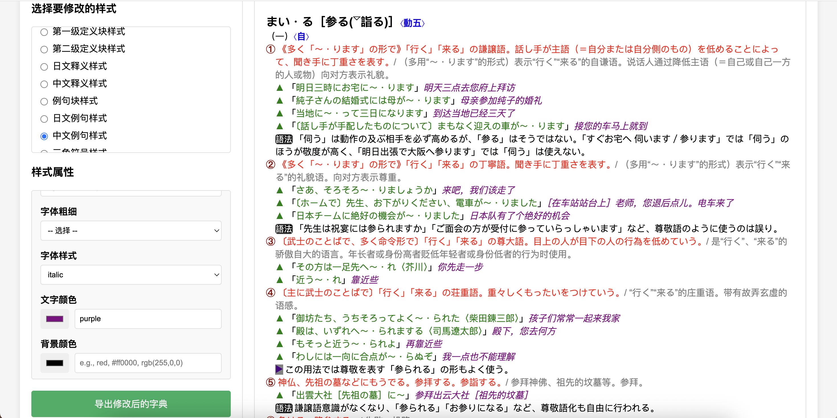 另外,我借助 Claude 老师的帮助,写了个能够修改 1.4.3 版本词典样式的工具,就是上面的 明镜日汉Yomitan辞典样式编辑器.html.zip,点开网页就可以用了,可以简单修改字体大小、颜色、边框等,希望对大家有所帮助。(只能修改 1.4.3,因为我在 1.4.3 版本加入了一些确定块类型的标记)