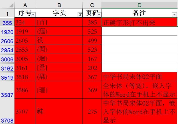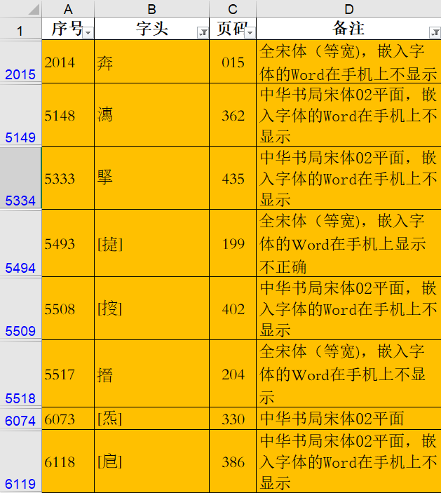 橙黄色底的字头,是我们在校对时曾经出错过的,有的还在备注栏注明使用哪种字体可以正确显示;极个别红色底的字头,则是备注很容易出错的字形,有的在备注栏说明“正确字形打不出来”。