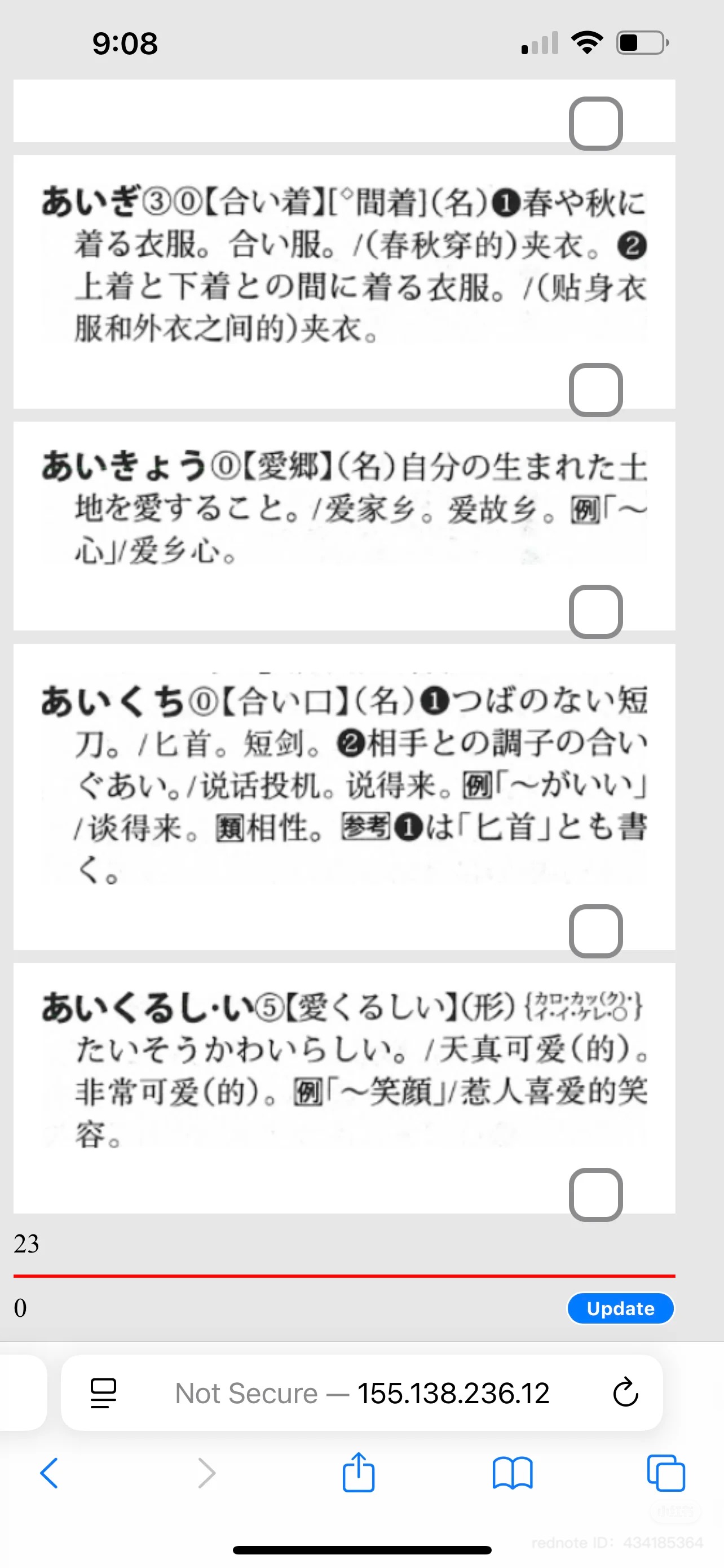 每天可以背50(默认,可调整)新单词。生成当日新单词和需要复习的旧单词。打勾想永久删除的单词(过于简单的或者以前背过的),点最下面的update会删除。未删除的单词以后会安排间隔复习。