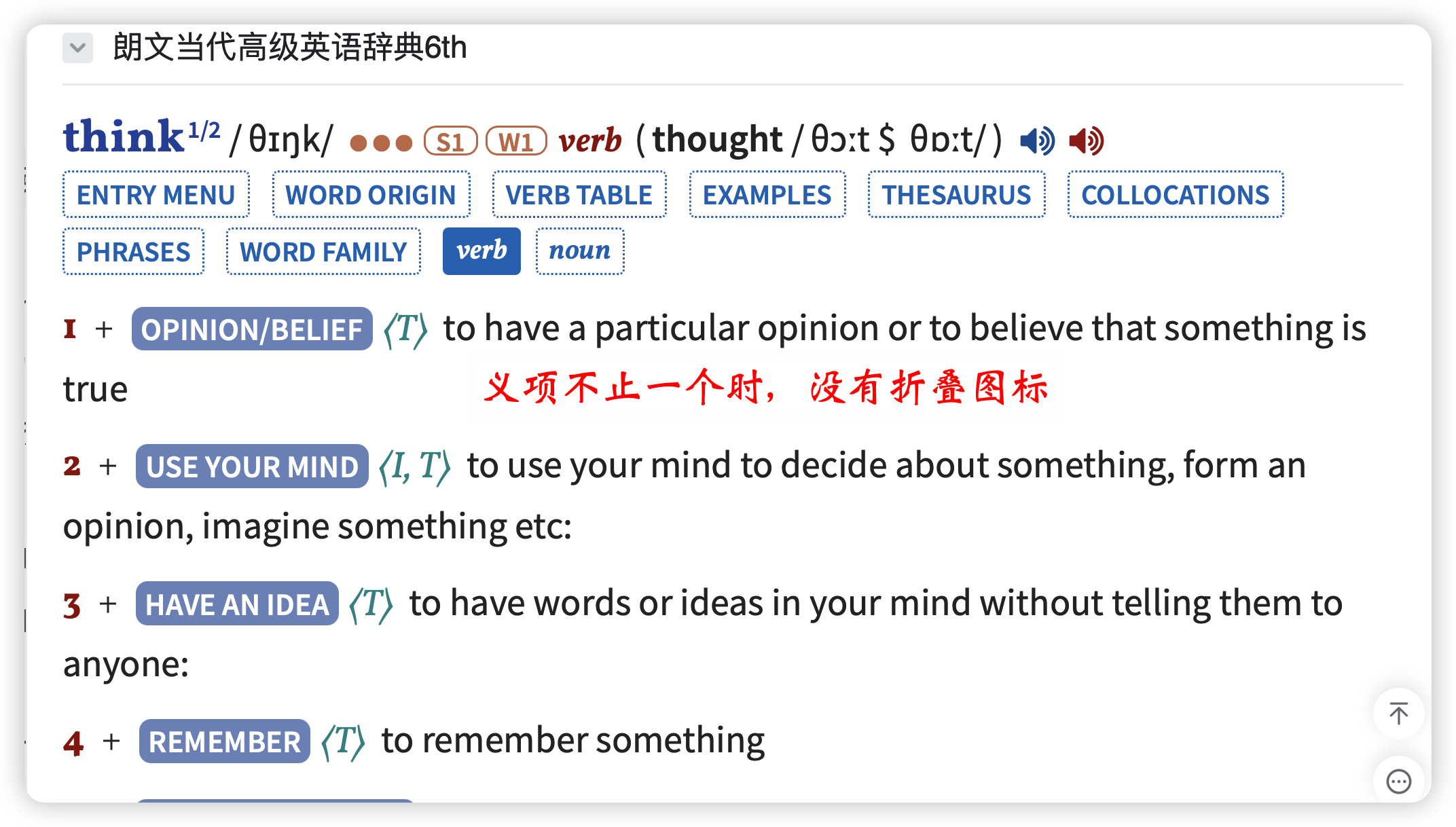 想了想,只有一个义项时没有数字标号,因此需要保留折叠按钮来折叠例子,K大考虑很周到