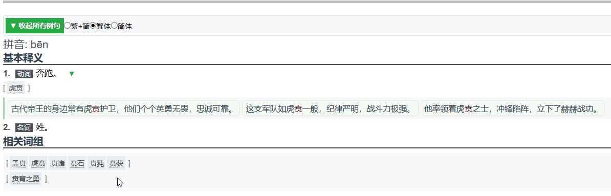 选择“繁体”,那个白色背景条那里出现了,却出现了“简体例句”。
