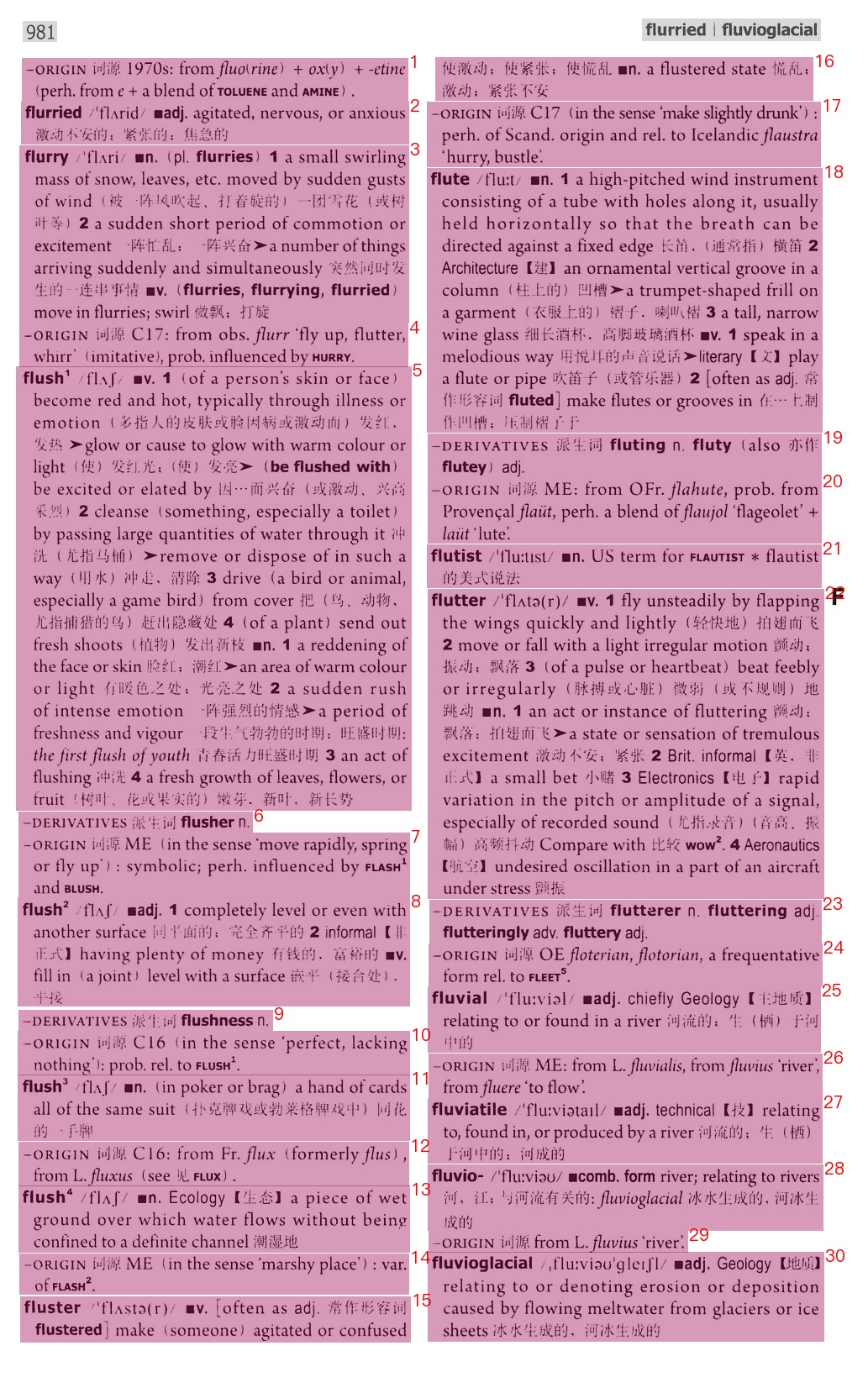–ORIGIN 词源 C17: from obs. flurr ‘fly up, flutter, whirr’ (imitative), prob. influenced by HURRY.flush¹ /flʌʃ/ ■v. 1 (of a person’s skin or face) become red and hot, typically through illness or emotion (多指人的皮肤或脸因病或激动而)发红,发热 ➤ glow or cause to glow with warm colour or light (使)发红光;(使)发亮 ➤ (be flushed with) be excited or elated by 因…而兴奋(或激动、兴高采烈) 2 cleanse (something, especially a toilet) by passing large quantities of water through it 冲洗(尤指马桶) ➤ remove or dispose of in such a way (用水)冲走,清除 3 drive (a bird or animal, especially a game bird) from cover 把(鸟,动物,尤指捕猎的鸟)赶出隐藏处 4 (of a plant) send out fresh shoots (植物)发出新枝 ■n. 1 a reddening of the face or skin 脸红;潮红 ➤ an area of warm colour or light 有暖色之处;光亮之处 2 a sudden rush of intense emotion 一阵强烈的情感 ➤ a period of freshness and vigour 一段生气勃勃的时期;旺盛时期:the first flush of youth 青春活力旺盛时期 3 an act of flushing 冲洗 4 a fresh growth of leaves, flowers, or fruit (树叶、花或果实的)嫩芽,新叶,新长势