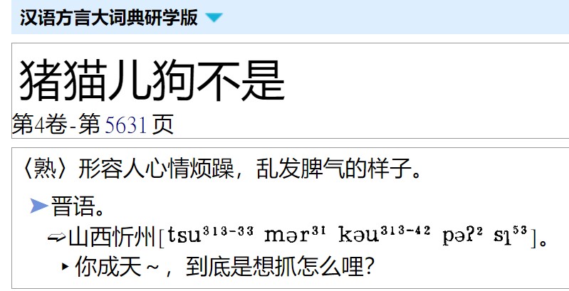 《汉语方言大词典》收“猪猫儿狗不是”:“形容人心情烦躁,乱发脾气的样子。”
