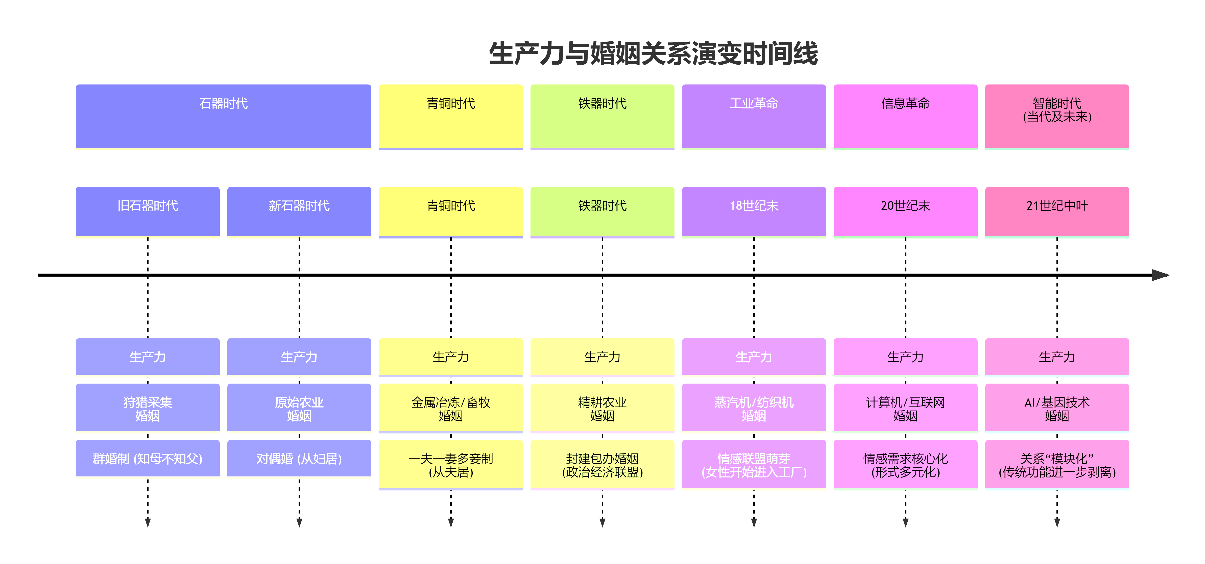 你的观点不能说错误,只能说正确,但是比较宽泛。例如是更自由更多元。我不能说你错,只是觉得你的观点不够犀利,不够鲜明。没有醍醐灌顶,听君一席话,胜读十年书的那种感觉 我们可以把时间节点更加的具体一点,放在生产力提升重大变革的时期。例如石器时代,比如说石器的制作,青铜器时代青铜器的制作,铁器的制作,包括治理纺纱机,包括酷计算机信息革命,哦,对了,还有蒸汽机的发面。这些关键的生产力突破的时间节点上来看当时的婚姻情况的变化。也许对当下的婚姻同时也是ai技术突破时期的参照参考。你帮我回忆一下这几个关键的时间节点,当时的婚姻变化以及包括人对待两性,对待伴侣,的思想变化。