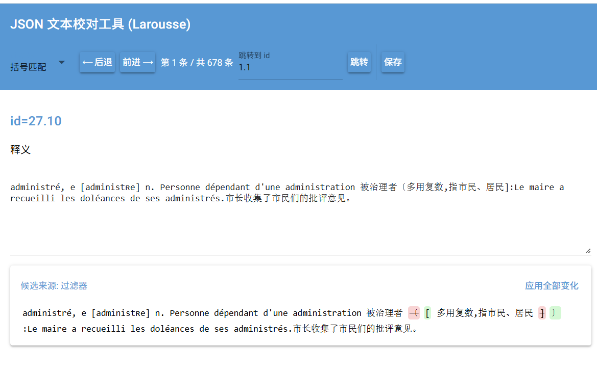 校对工具大更新,支持候选文本用不同的key查找,支持过滤字符比较,可以对比中文和法文,应用变化和替换文本分开。上方可以自定义各种字段跳转(比如拉鲁斯可以跳转到指定页page,指定页指定条目id,指定条目_index和指定单词headword。