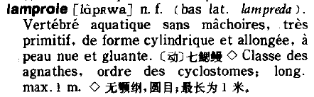 校对过程中发现原词典也有少量文字讹误,多处把“脉搏”写成“脉博”,“最后通牒”成了“通谍”,像这里(见P1101)的lamproie,当为“无颌纲,圆口目;最长为1米”,在书中印成了“无颚纲,圆目;最长为1 米”,无论译者还是编辑,稍微有点动物学常识,就会知道它们是错的。