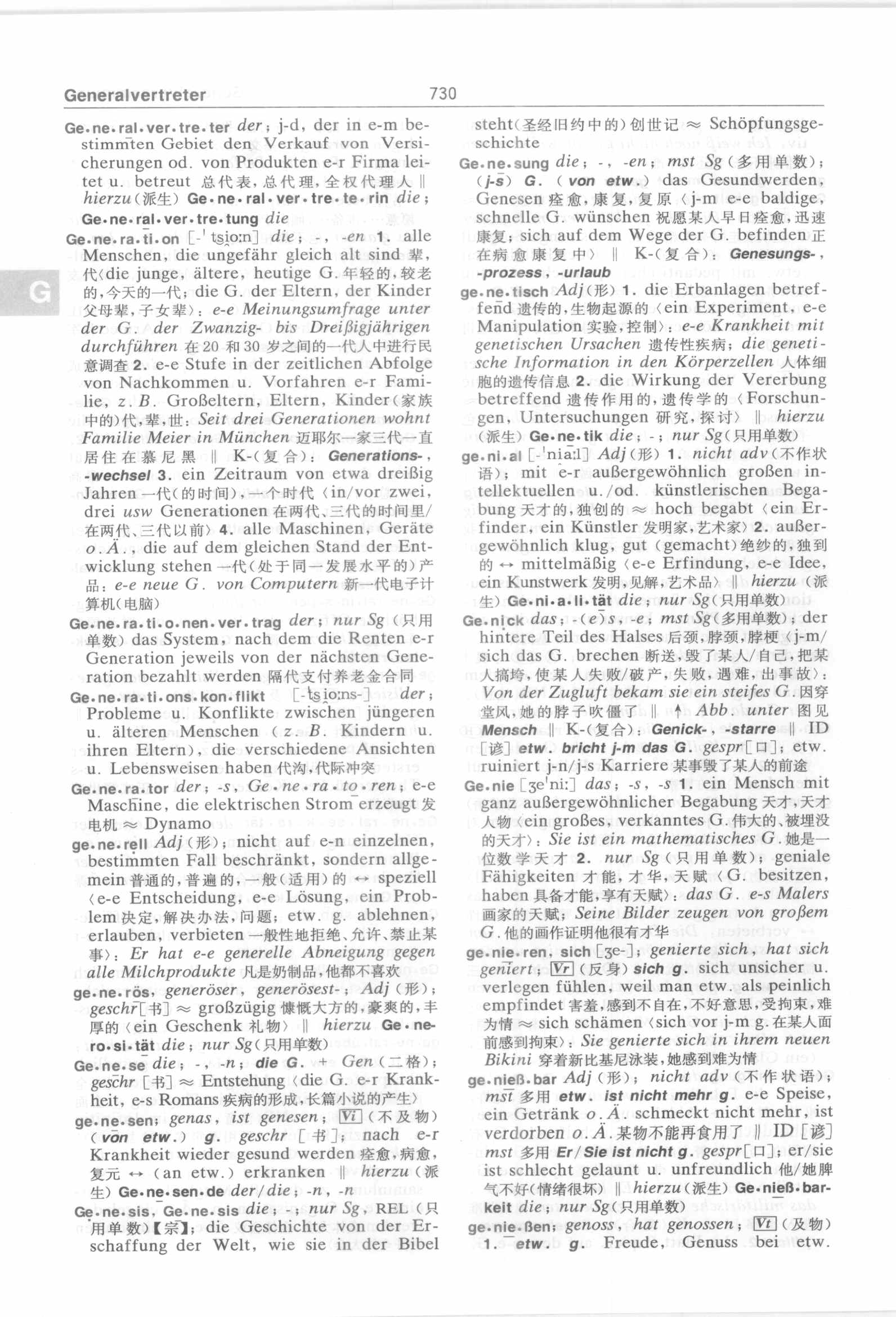 Ge·ne·ra·ti·on [-'tsjo:n] die; - , -en 1. alle Menschen, die ungefähr gleich alt sind 辈, 代⟨die junge, ältere, heutige G. 年轻的, 较老的, 今天的一代; die G. der Eltern, der Kinder 父母辈, 子女辈⟩; e-e Meinungsumfrage unter der G. der Zwanzig- bis Dreißigjährigen durchführen 在20和30岁之间的一代人中进行民意调查 2. e-e Stufe in der zeitlichen Abfolge von Nachkommen u. Vorfahren e-r Familie, z. B. Großeltern, Eltern, Kinder (家族中的)代, 辈, 世: Seit drei Generationen wohnt Familie Meier in München 迈耶尔一家三代一直居住在慕尼黑 || K-〔复合〕: Generations-wechsel 3. ein Zeitraum von etwa dreißig Jahren 一代(的时间), 一个时代 ⟨in/vor zwei, drei usw Generationen 在两代、三代的时间里/在两代、三代以前⟩ 4. alle Maschinen, Geräte o. Ä., die auf dem gleichen Stand der Entwicklung stehen 一代(处于同一发展水平的)产品: e-e neue G. von Computern 新一代电子计算机(电脑)