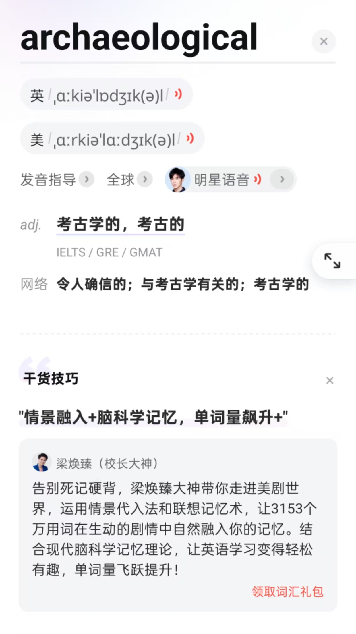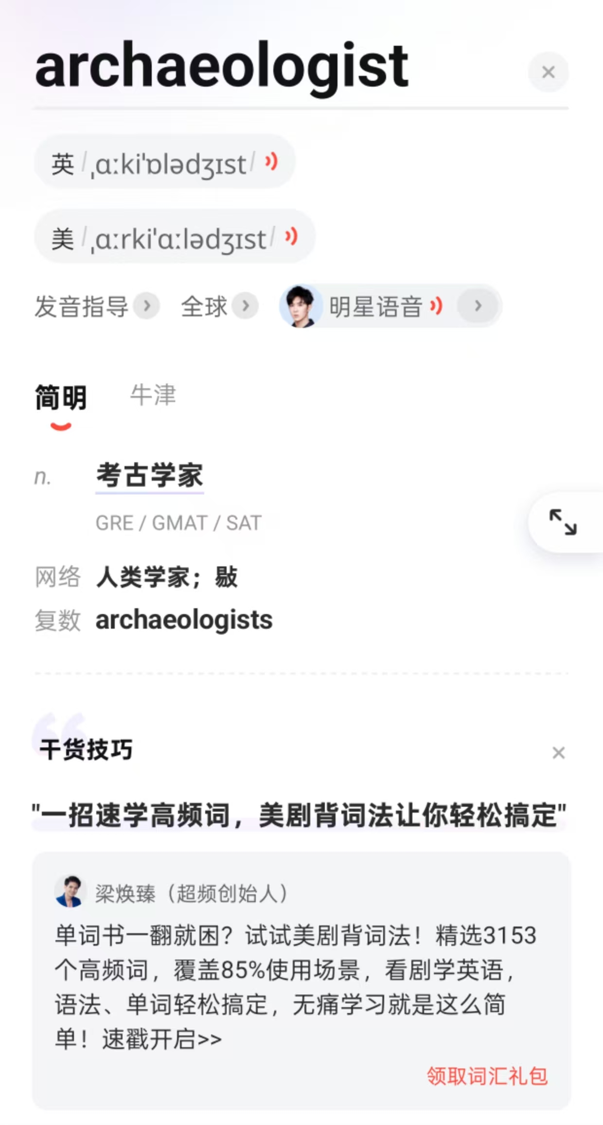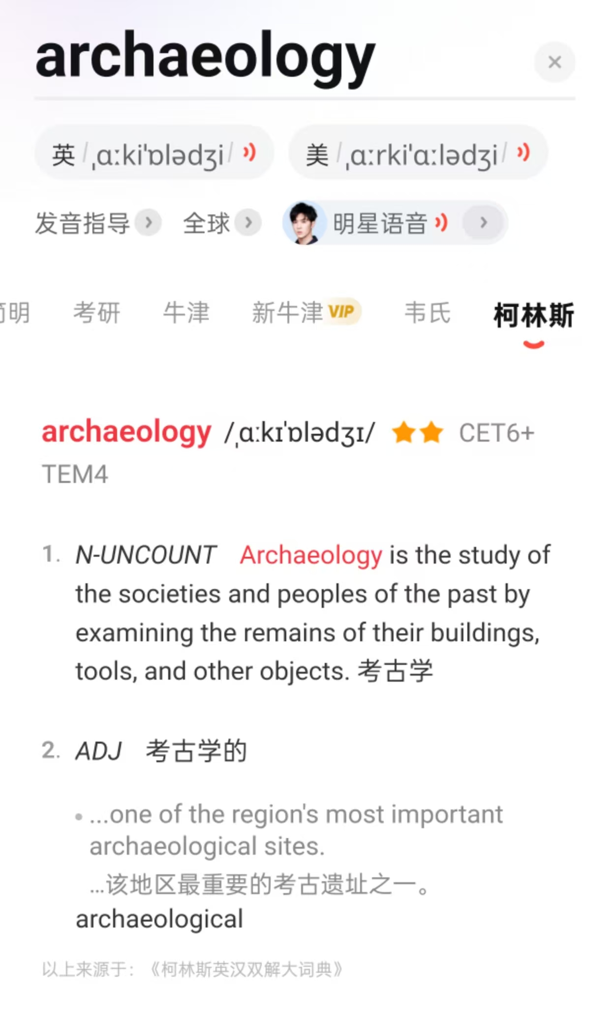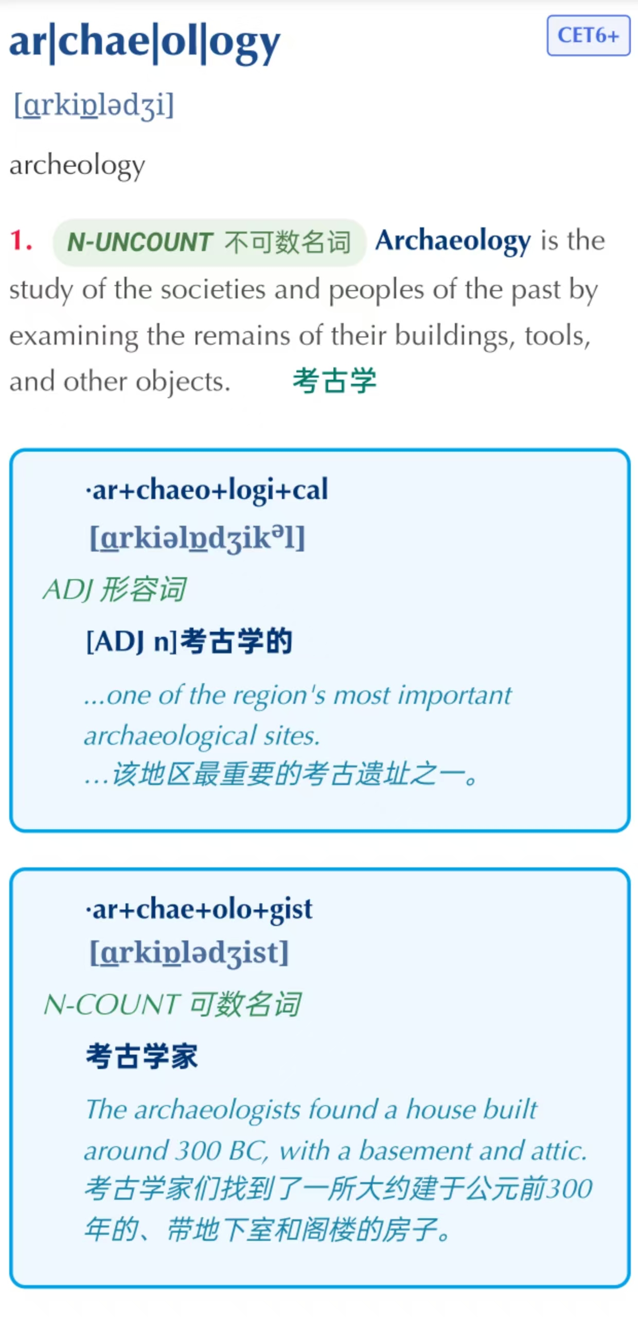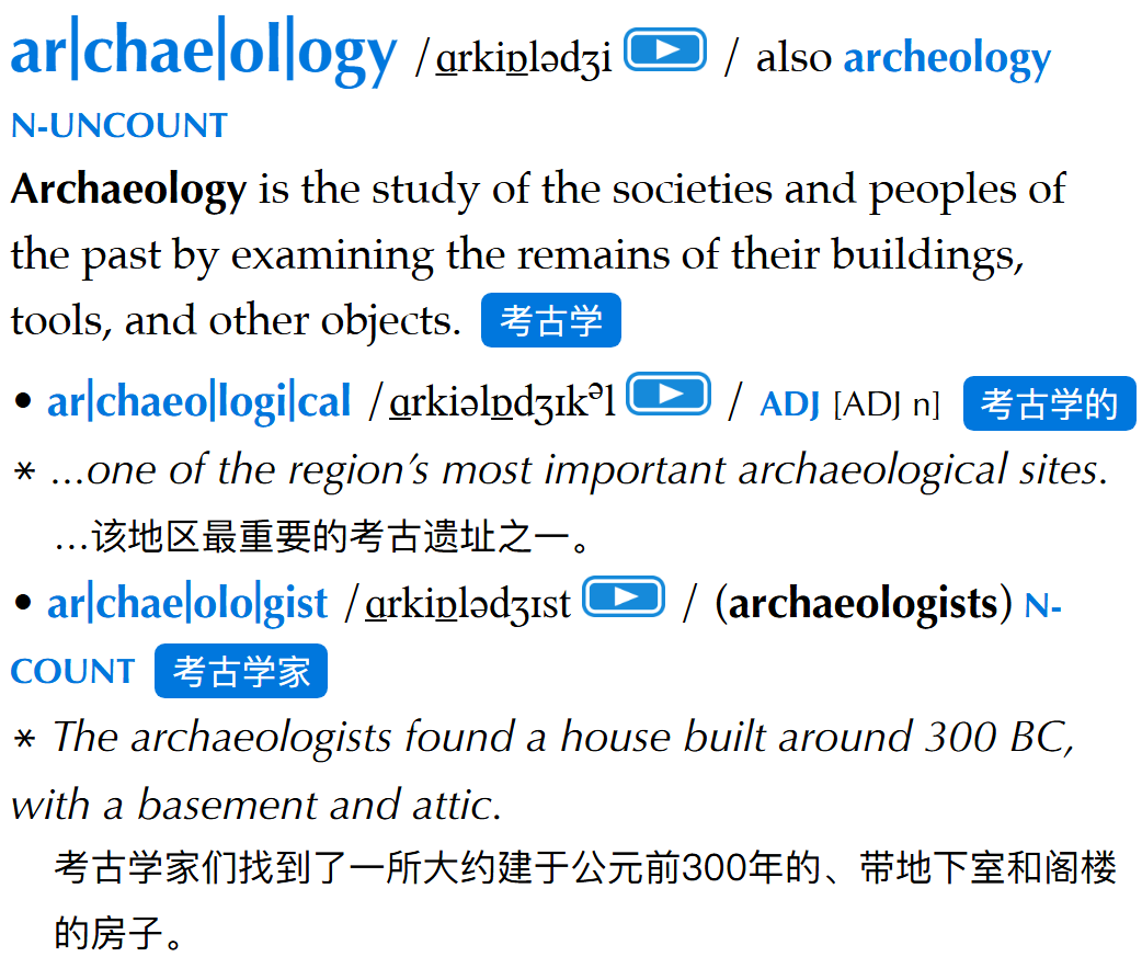 比如,archaeology,纸质版是有两个派生词的,而且都有翻译,有道全部漏掉了第二个: