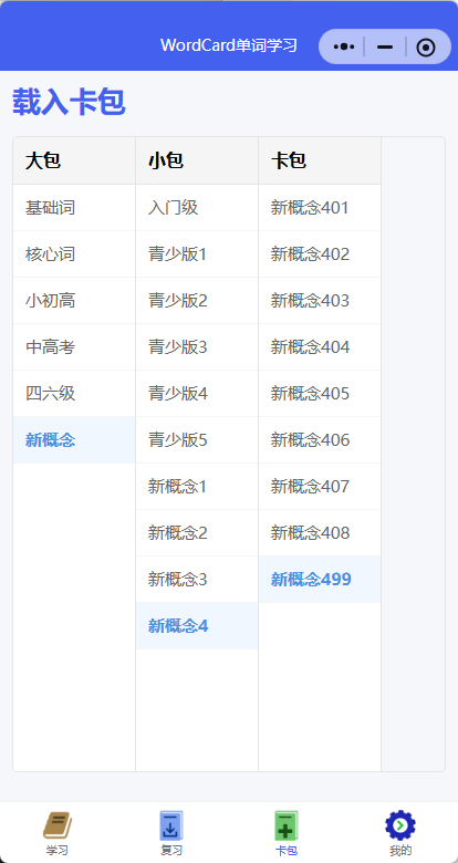 卡包数据在WordCard小程序内已有内置,可以直接选取。