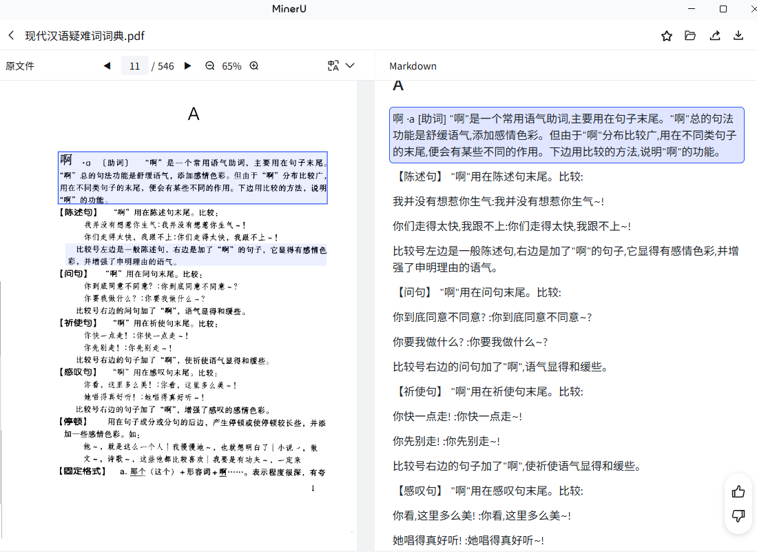 MinerU 用的识别引擎是 PaddleOCR,中文识别错误率较高,得到的文本自己随便翻翻还行,就做词典而言,是没法用的,像这里的文字,拼音基本都是错的,没有音调,隐藏的其他讹误也不少。