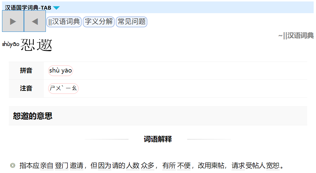 恕邀。只有常用解释,没有详细解释说明他不是汉大的词。