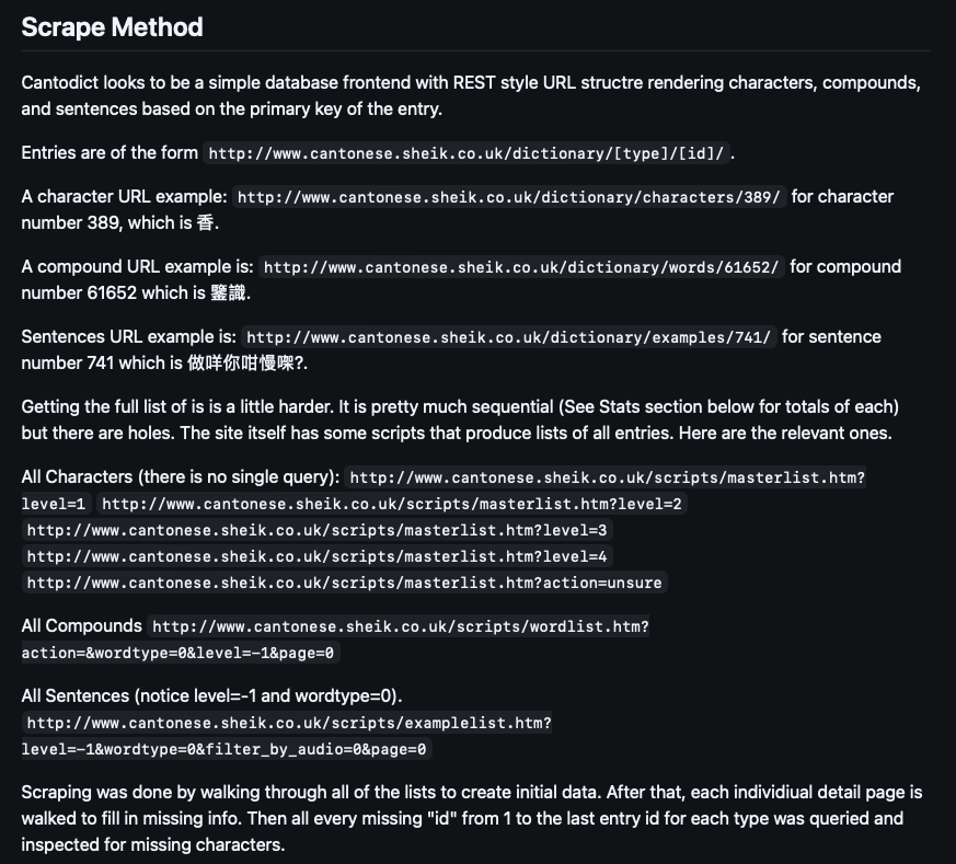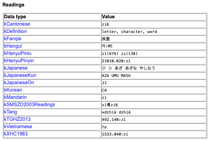 另外,更完整更官方的是 Unihan Database 了。当然,局限性是,真的就只是 字 而不包括语言中更重要的单位 词 。