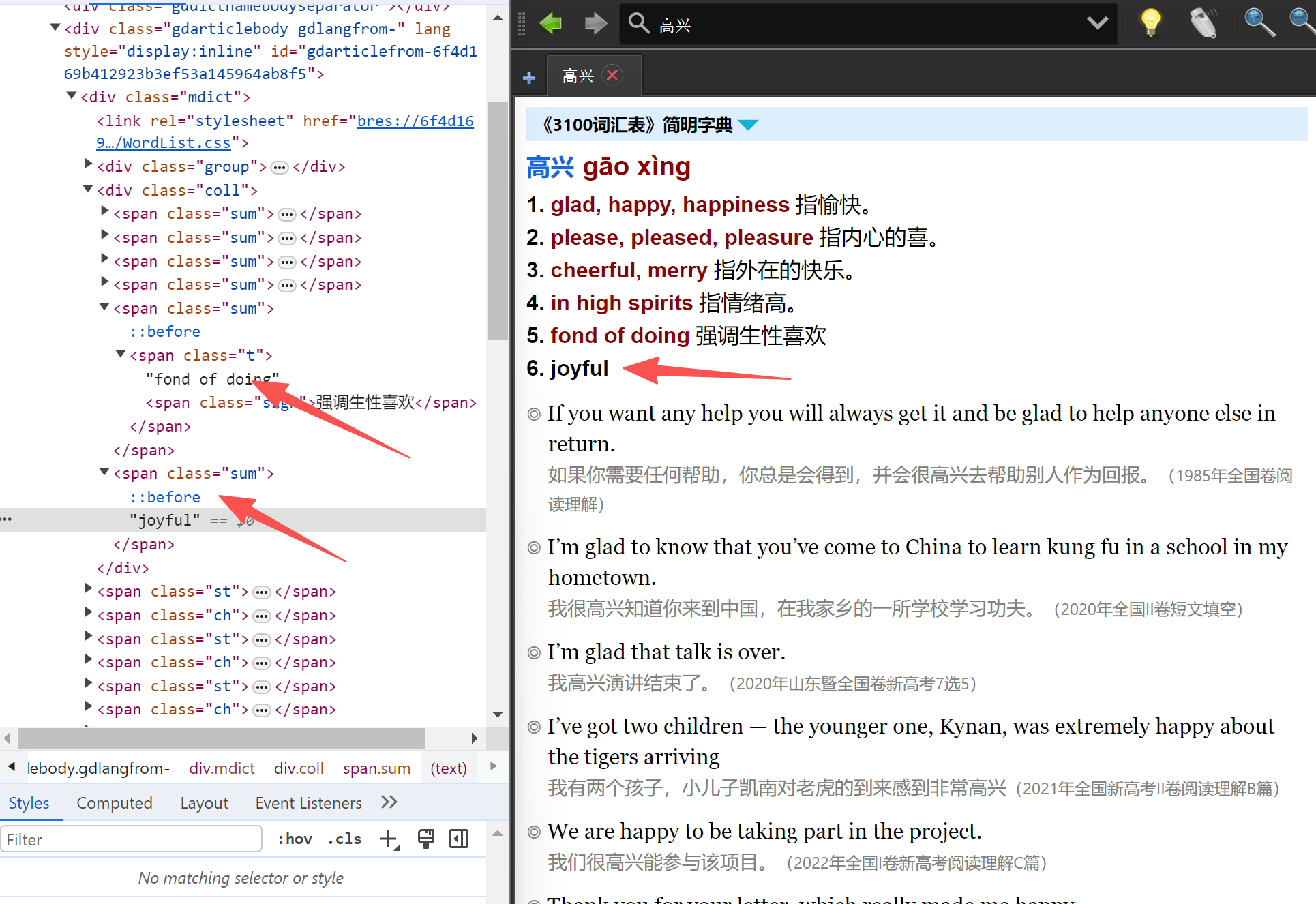 晚上用Golden-NG测试写一个css,从477行以下复制或者看起,主要美化了小标签,美化了高考原题句子的排列,间距,字体,字号,颜色,换行等,详情查阅源码里的注释。另外发现一些源码的问题,应该是没有闭合,渲染的时候没有补全造成部分css不起作用。如中文词头 问题 等。