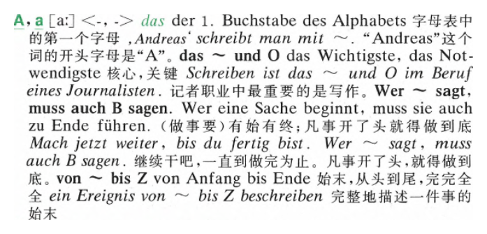 Abc [abe’tse:] <-, → das das Alphabet 字母表 Schon im Kindergarten kannte das Mädchen das ganze ~. 上幼儿园的时候, 这个小姑娘就熟知字母表了。