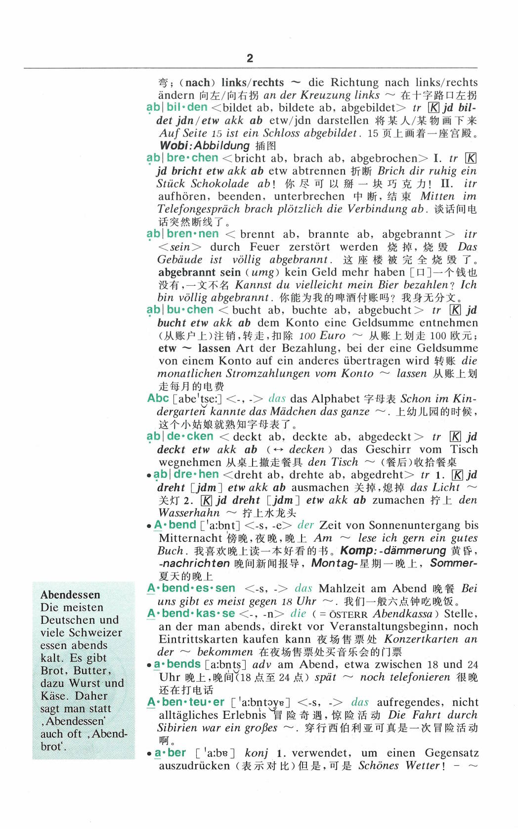 Die meisten Deutschen und viele Schweizer essen abends kalt. Es gibt Brot, Butter, dazu Wurst und Käse. Daher sagt man statt ,Abendessen‘ auch oft ,Abendbrot‘.A·bend·es·sen <-s, → das Mahlzeit am Abend 晚餐 Bei uns gibt es meist gegen 18 Uhr ~. 我们一般六点钟吃晚饭。