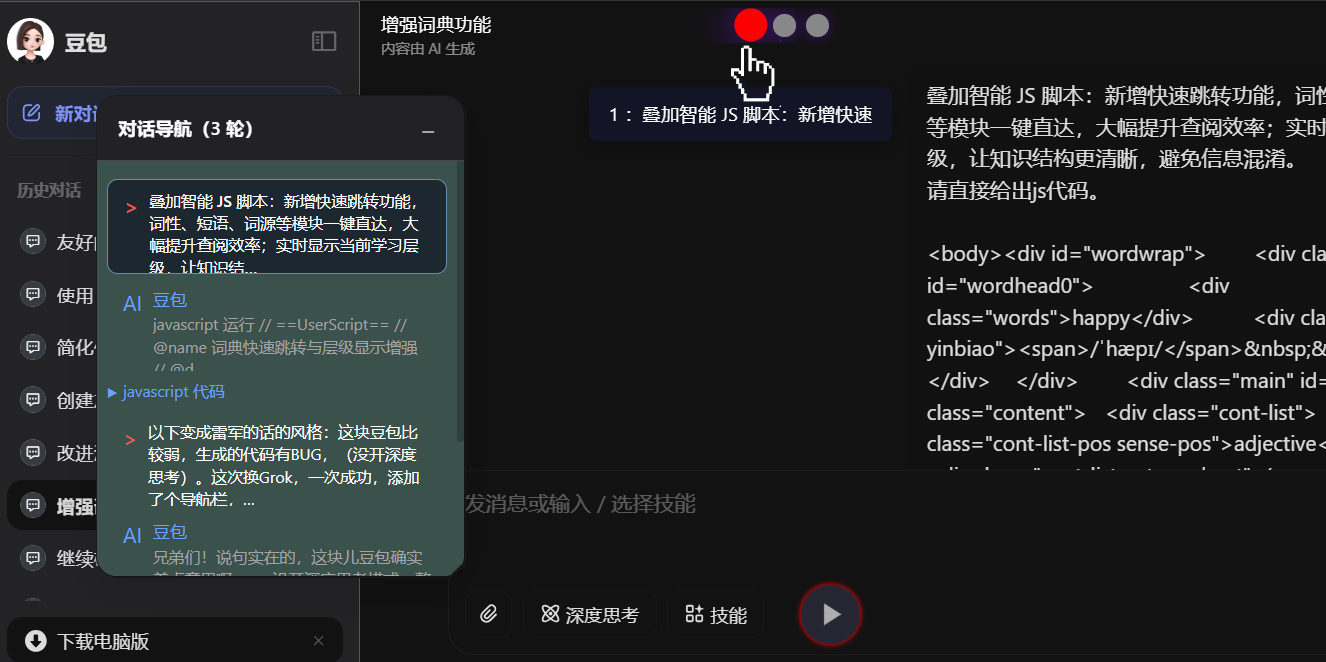 顺便魔改一下豆包,问答也需要导航栏,不然太长了,鼠标滚轮不是这么用的。