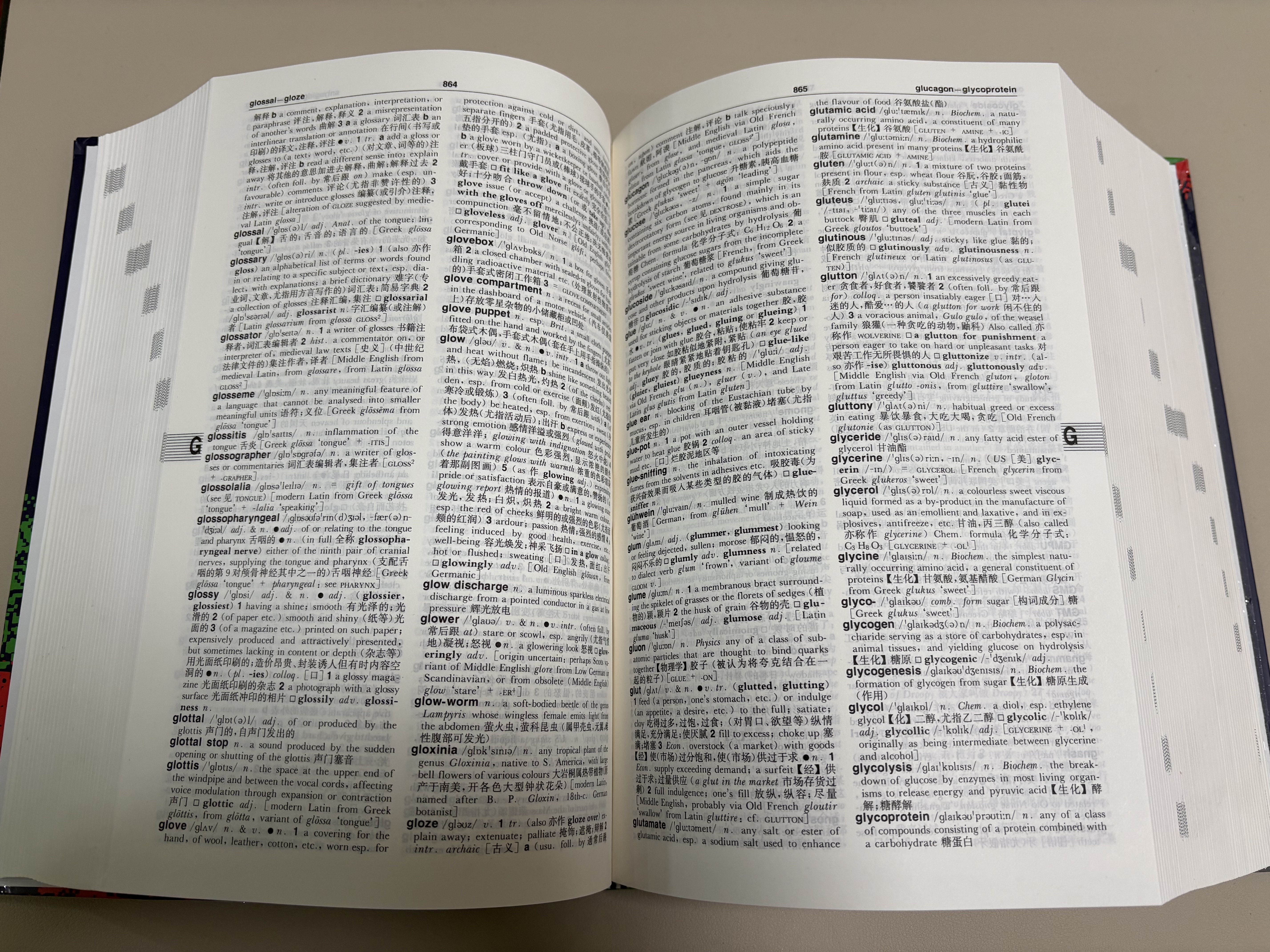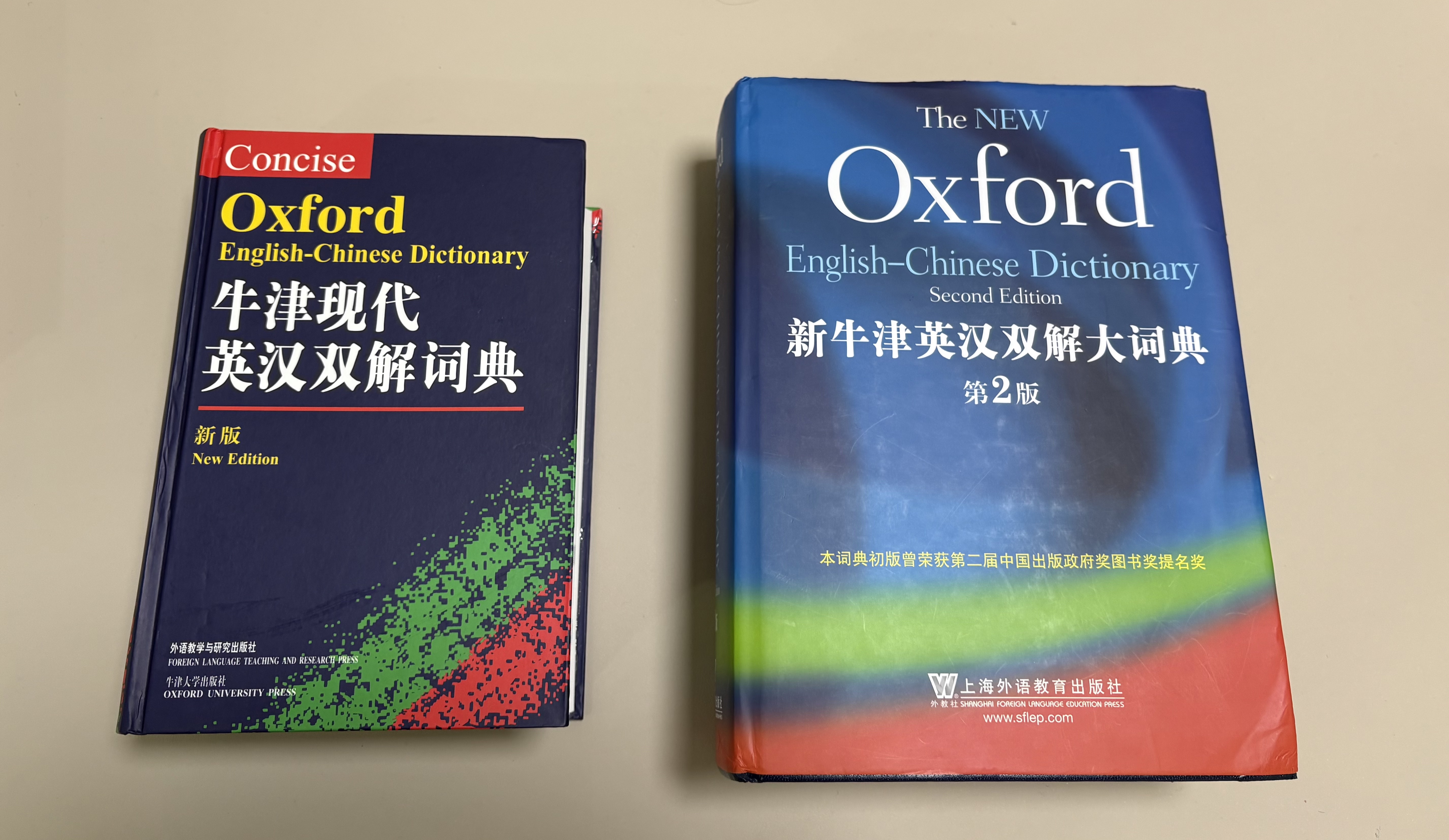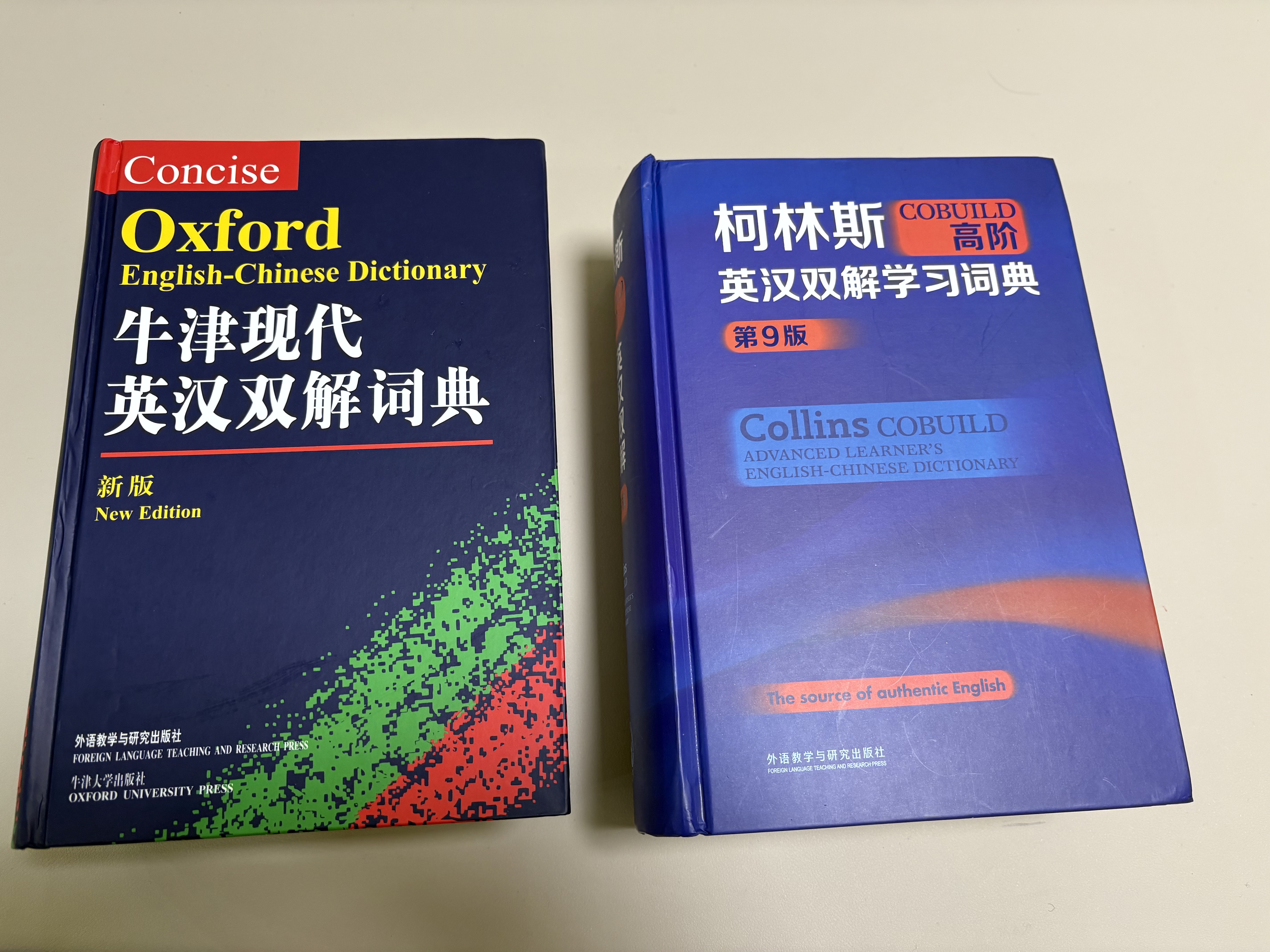 拿起来跟柯林斯高阶第九版比较一下,二者在厚度和大小上都差不多,文字大小也差不多。众所周知,柯林斯词典以每个单词冗长的英文解释著称,且作为学习型词典,例句丰富,搭配各种用法。而COD9作为母语词典,解释简洁明了,却能在厚度上与柯林斯不相上下,由此可推测,COD9的收词量远超柯林斯。需强调的是,COD9的简洁解释绝非简单或简陋,反而精准到位,直击要害,长久以来在英语母语词典领域占据权威地位。当然,柯林斯的解释也有其独特优势。我喜爱用柯林斯来背单词,因为在缺乏语境的情况下,其详细解释能提供良好的语境参考,基本无需再查阅例句。而COD9则更适合在阅读时查询,毕竟阅读时单词本身就处于特定语境中,此时精准、简洁的解释更为实用。此外,我这本柯林斯词典散发着一股刺鼻气味,不似普通油墨味,而这本牛津现代英汉双解词典(第9版)就没有。接下来再拿来跟新牛津(ODE)第二版来对比一下。