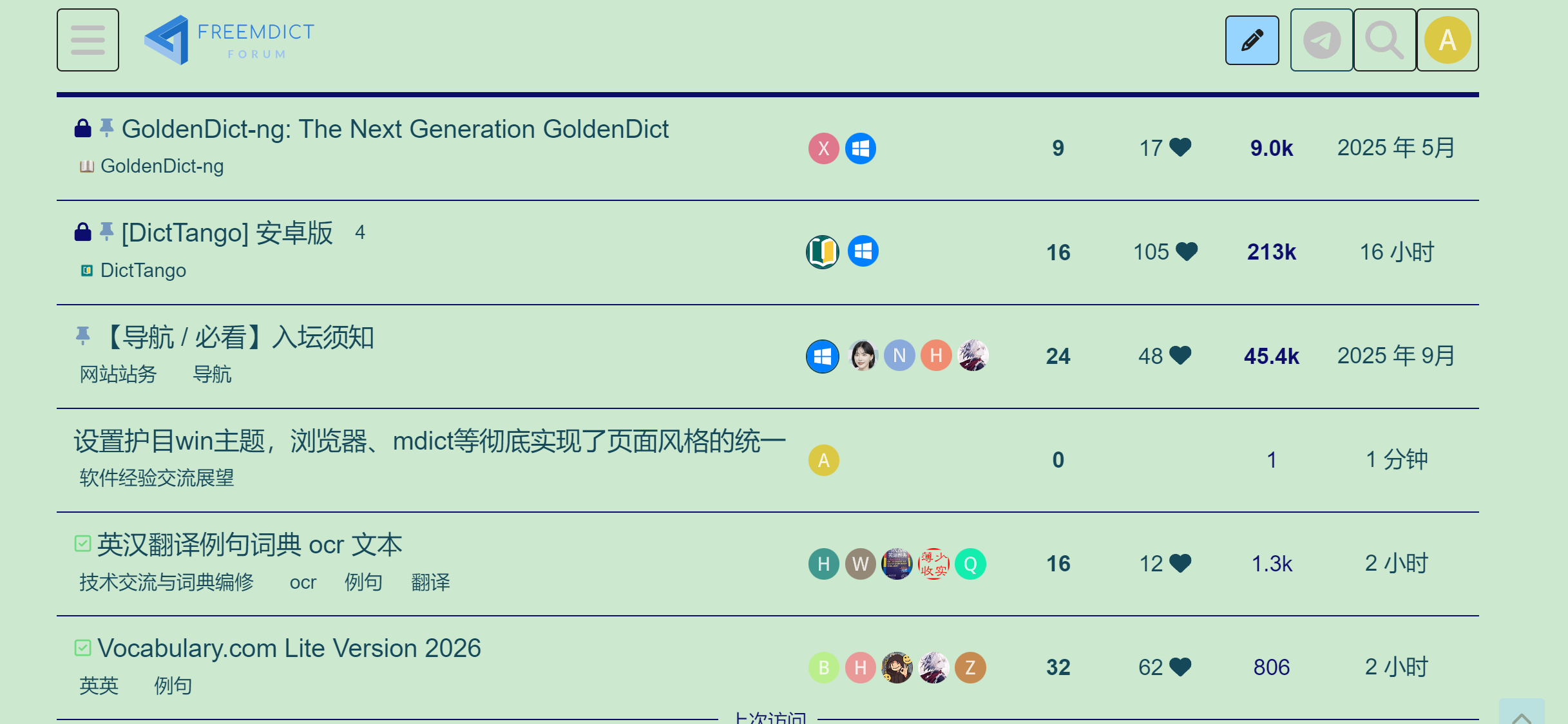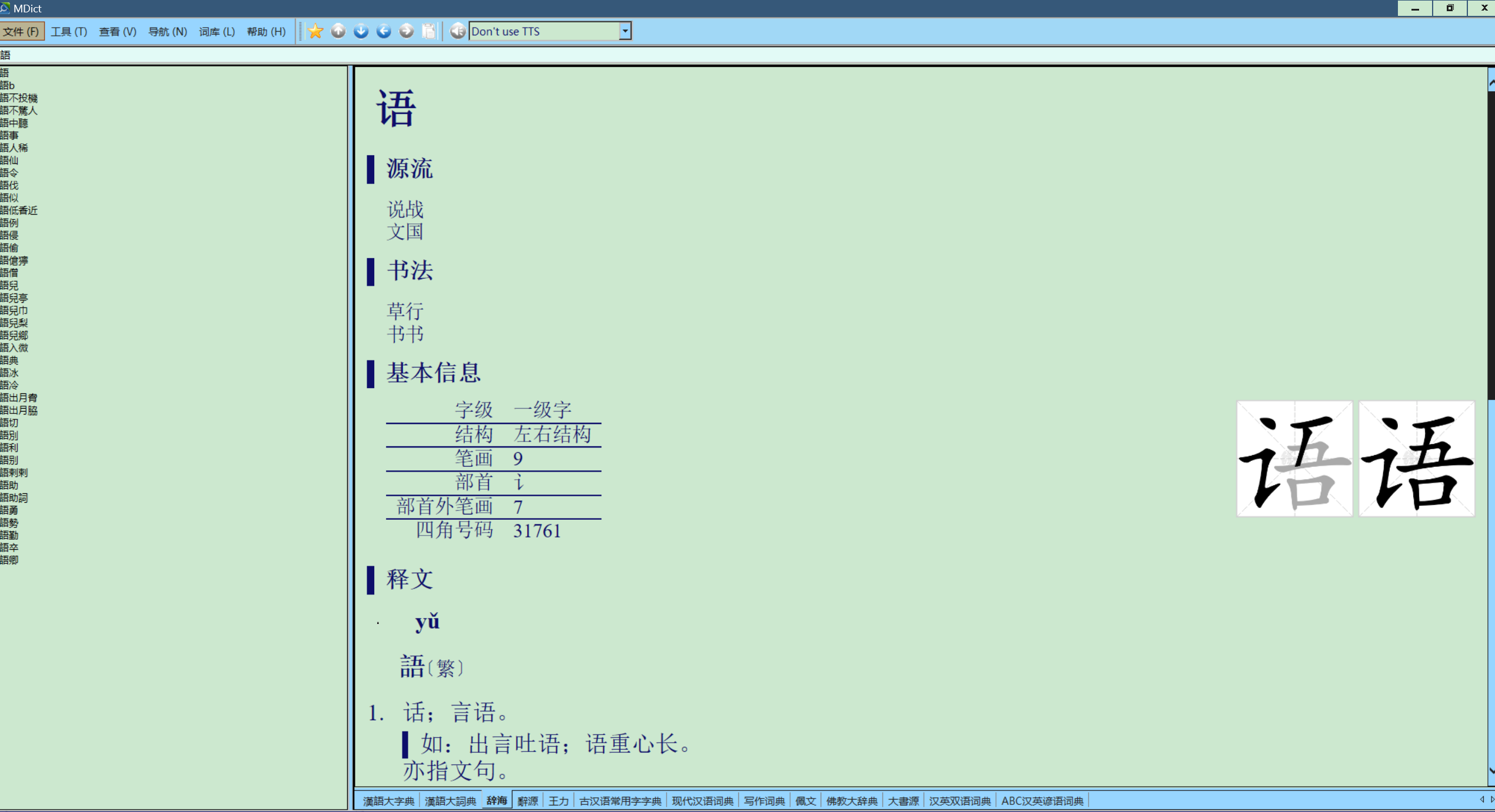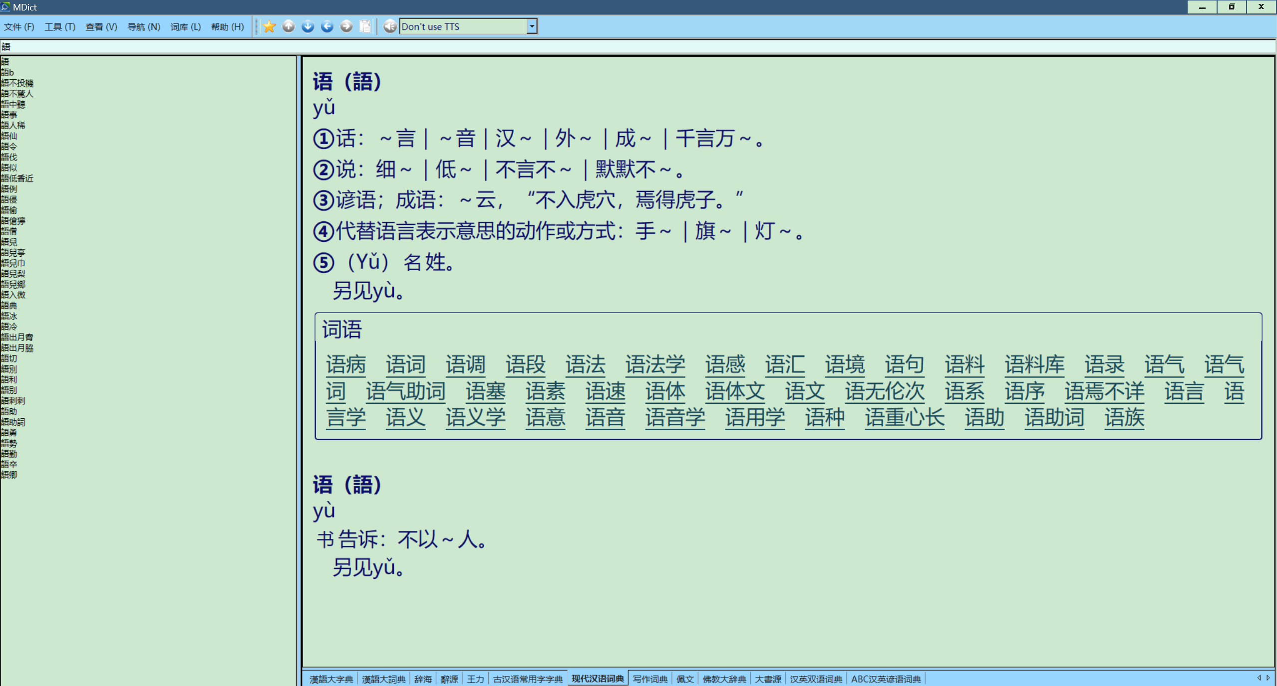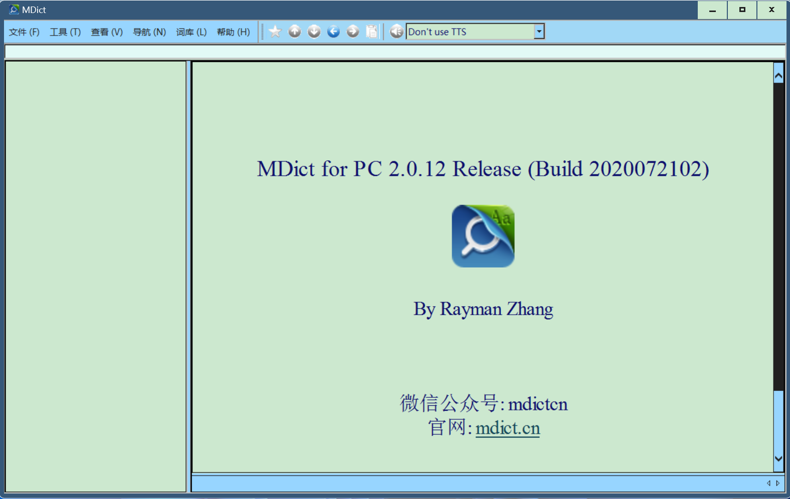 有一点觉得很奇怪,使用这个主题后,mdict的所有词典都变成统一的颜色(我设置的是浅绿色底,深蓝色文字),也就是说,加入的css都不起作用了。但我觉得这样的页面很好看,很舒服。但是GD不行,仍是原来的样子,并不“服从”win主题的设置。mdict的启动页面是这样子的。