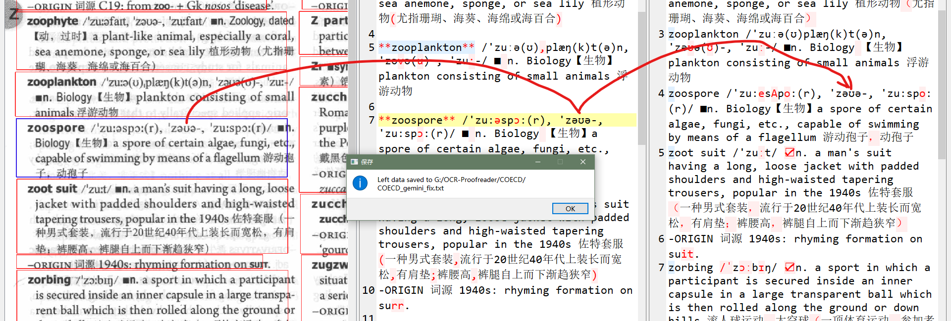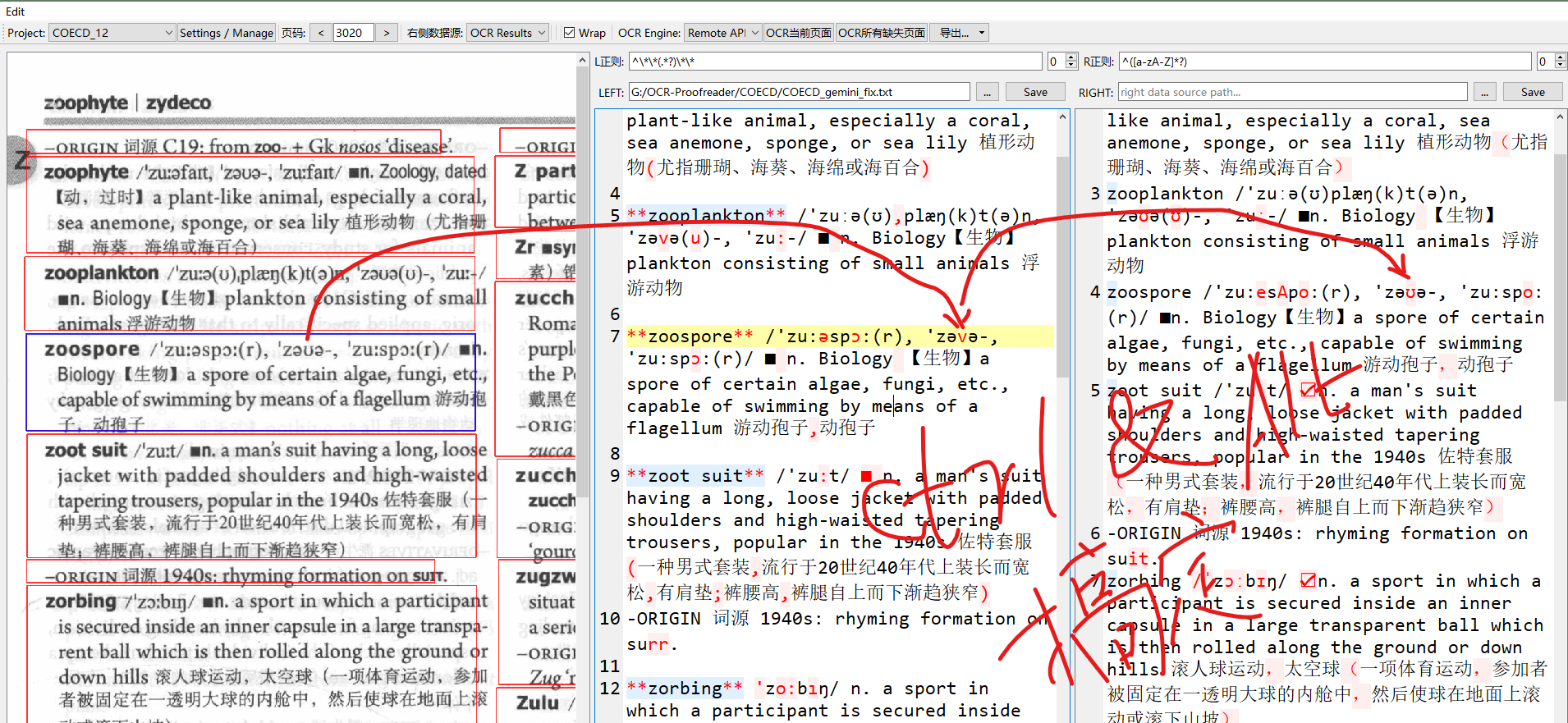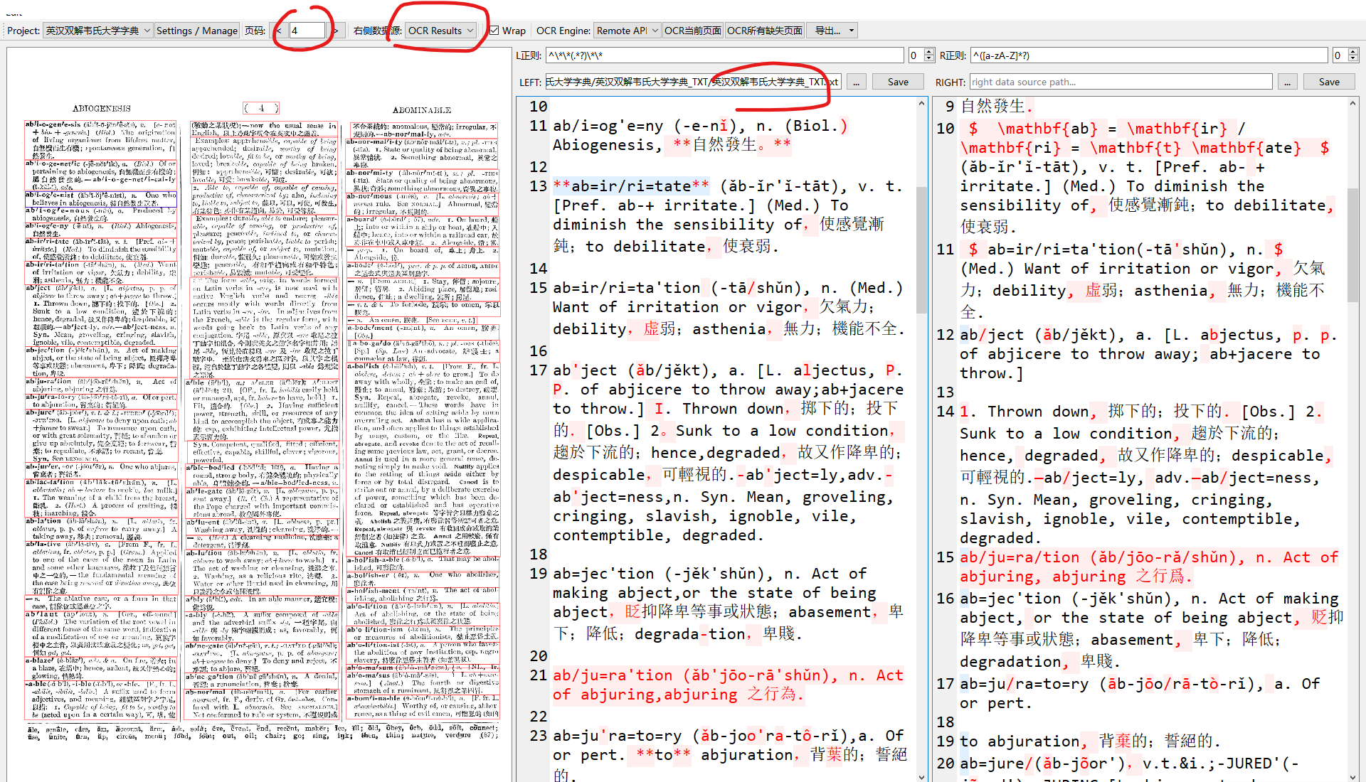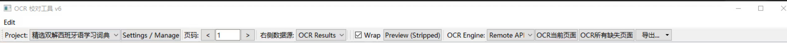 OCR文本默认是用来定位图片位置的,加载每一页时自动从指定的json目录中载入,选择数据源为OCR Result才会显示对应的文本,如果要导出ocr文本可以用导出菜单中选择导出全部ocr文本的功能。