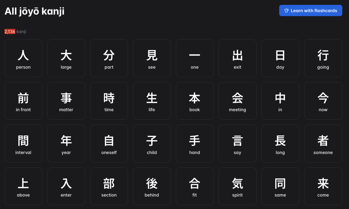 和之前的一个主题 ( 发现一个很好的 日语字词辞典 ) 非常类似,同样是巧合数字 2,136,但是这次遇到的一个网站在字以外多了词的层面。