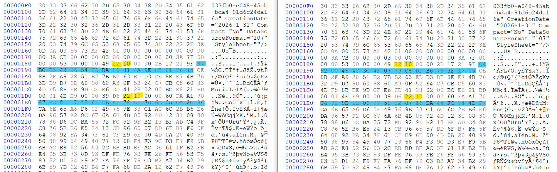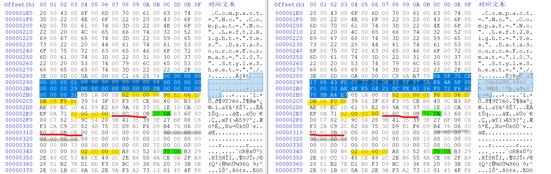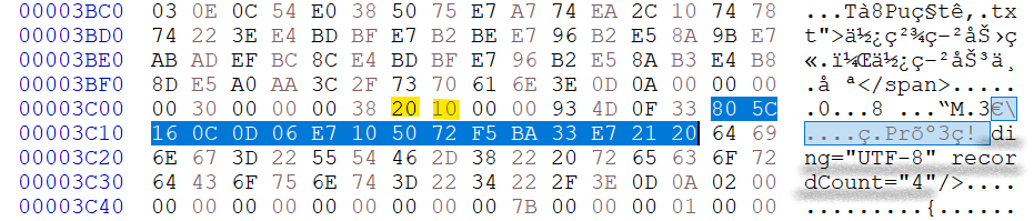 前面是文件头,可以看到在软件中使用加密密钥仅额外加密了哪哪数的部分(蓝底),比如对应的字节数块数还有词条数等,其他的也是所有实际的数据均不额外加密