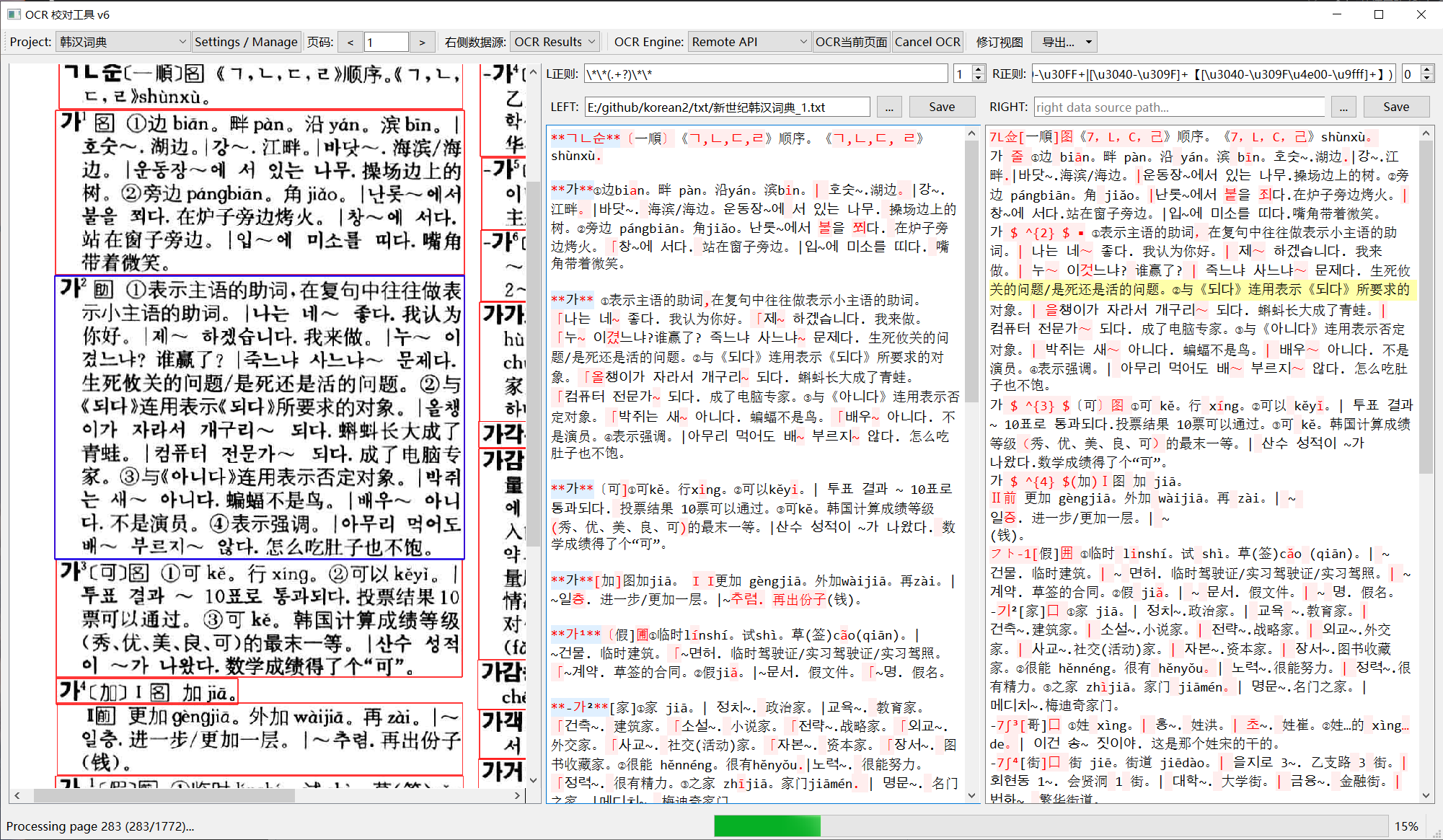 应坛友 @Syzygy 的请求ocr的这本词典,这次提供三个版本的数据,可以配合校对工具使用。韩语gemini整体更优,但paddleocr符号和中文标点更优。