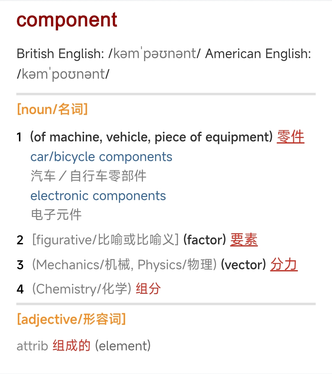 偶然间发现有道词典的正版牛津高阶十的component单词词条把它的adjective部分归置到了Derivatives派生词。