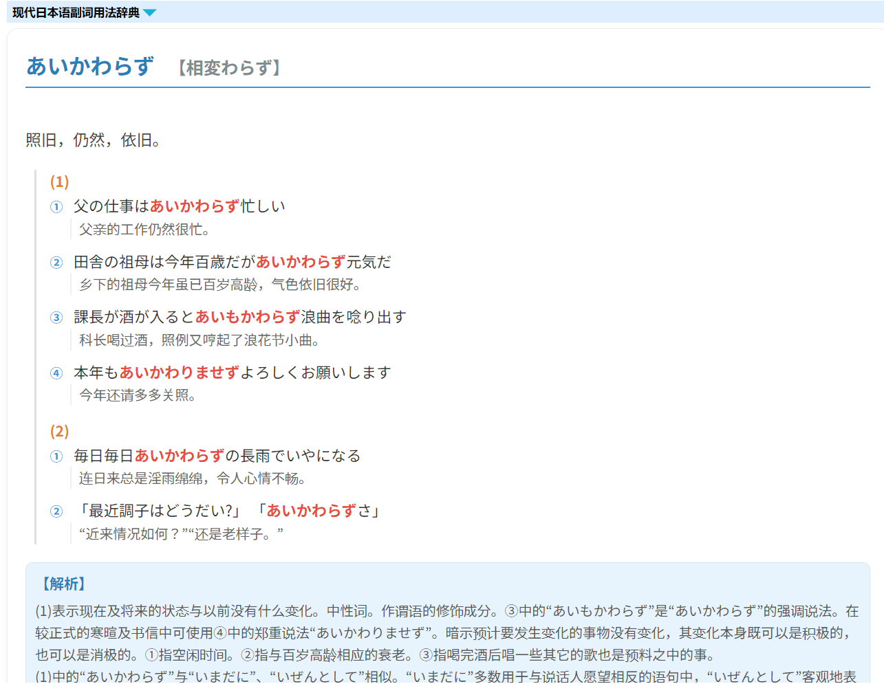 小的修正,解析部分不再添加高亮,对于匹配词头失败的例句(例如 あいかわりませず)进行了手动匹配。