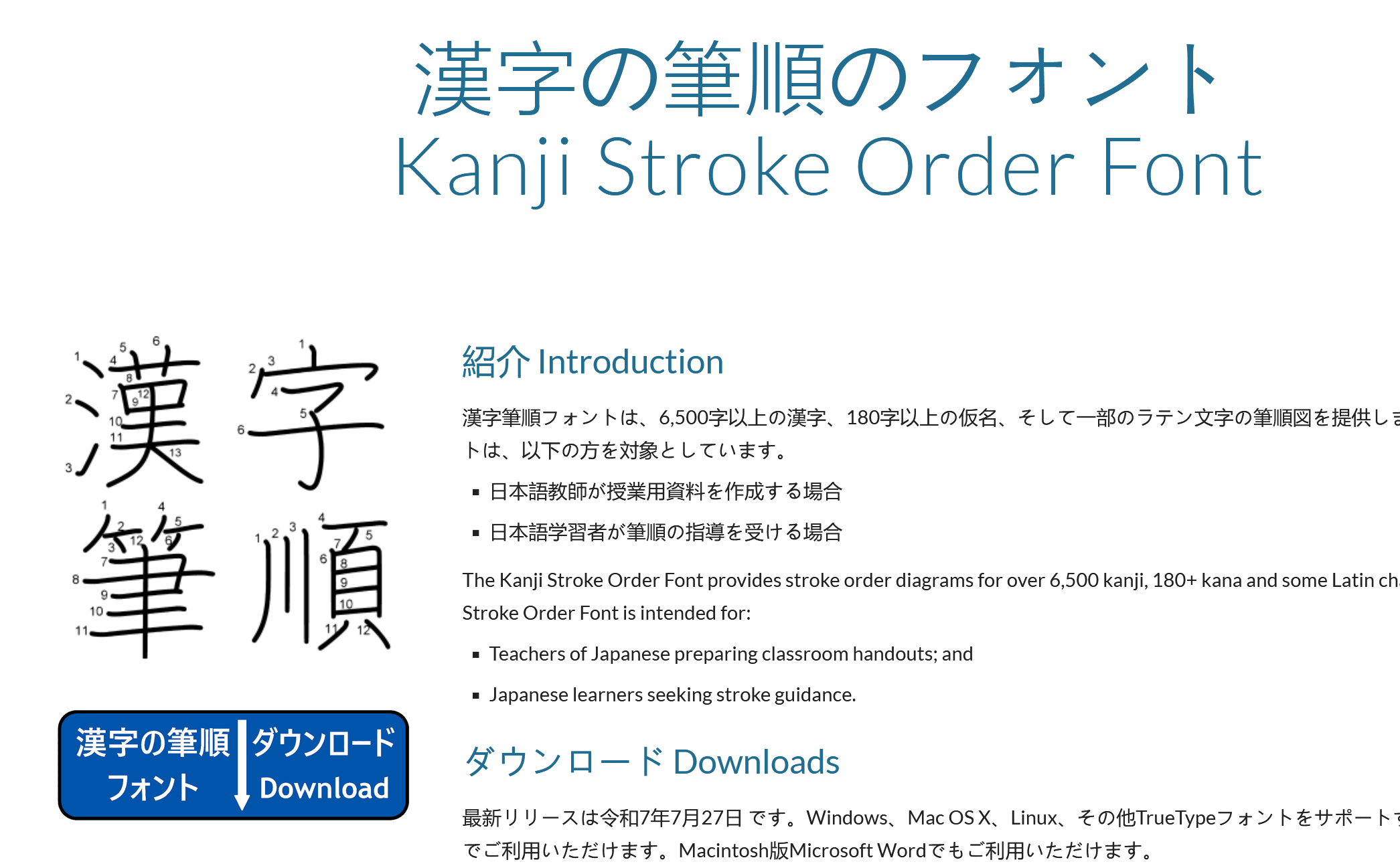漢字筆順フォントは、6,500字以上の漢字、180字以上の仮名、そして一部のラテン文字の筆順図を提供します。漢字筆順フォントは、以下の方を対象としています。