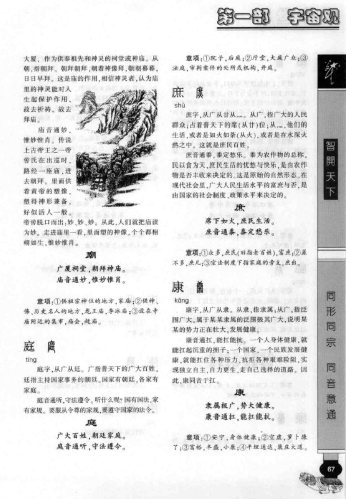 全书共十五部、189个专题集群,收录一万余字,涵盖繁简异篆多种字体。以“字形藏理,字音通意”为核心理论,阐释汉字同形同宗、同音意通的联系规律,通过解析“人”“信”“化”等字揭示自然伦理与人文准则。内容编排结合天文、地理、伦理等多维度,构建汉字与宇宙观、社会关系的关联体系,并建立音序、部首、专题三重检索系统 。书中对《汉语大字典》部首使用频率进行精密统计,整合历代字典研究成果,为汉字文化研究提供系统性文献参考。