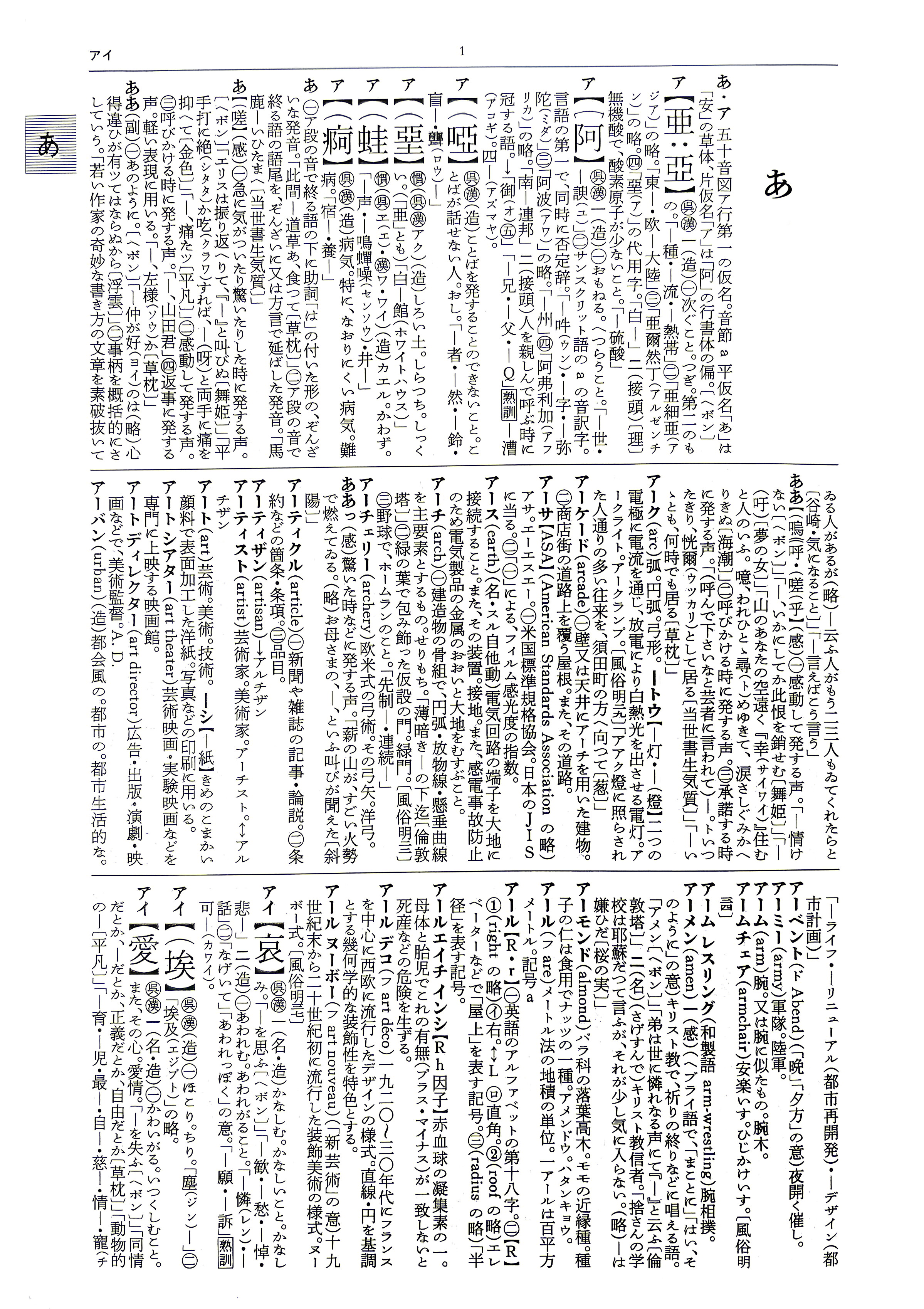 这本词典是比较有特色的,汉字部分标注了吴音唐音之类传统汉字辞典才会标的内容,而且例句很多是出自文学作品。此外本书和其他书不同,汉语词和其他外来语一样采用片假名标注。