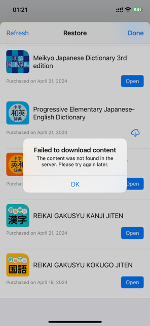 我尝试下载 Progressive Elementary JE Dictionary(应该是日英方向的初级词典)时,一直提示: