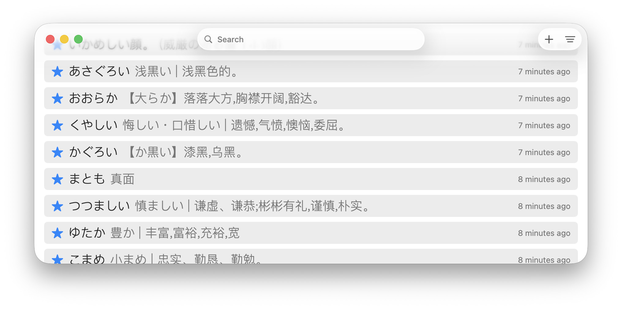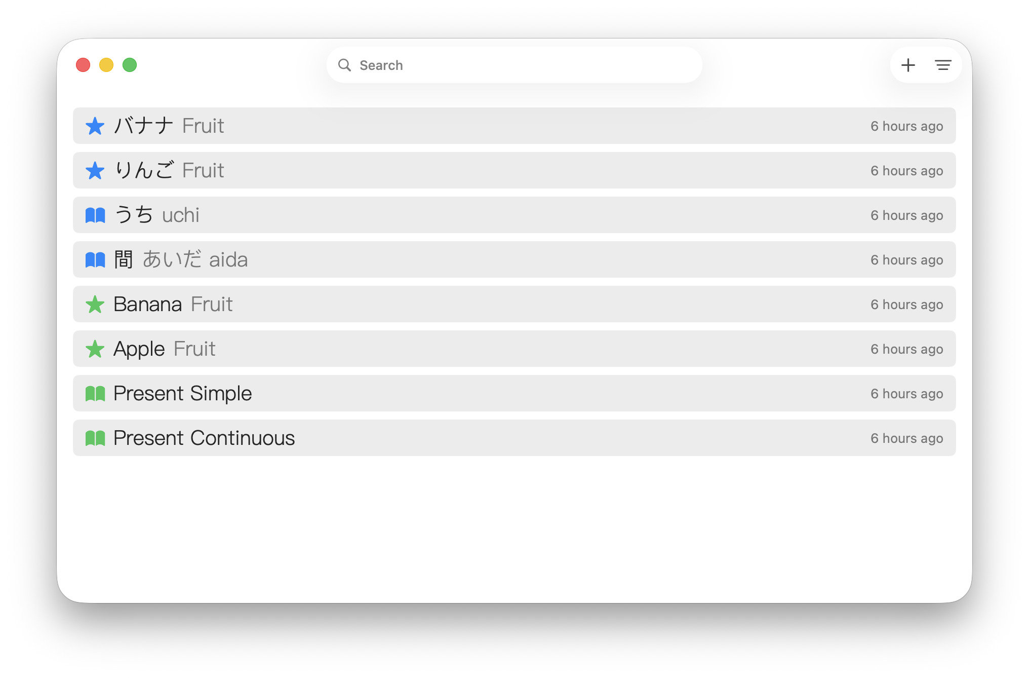 为了简洁,只保留了搜索和过滤。Entries 和 Senses 都禁止手动排版(写 md 时感觉这部分很费时间)。蓝色是日语,绿色是英语,星星是单词,书是语法。灰色字是 keywords 可以用来辅助搜索或者进一步分类。