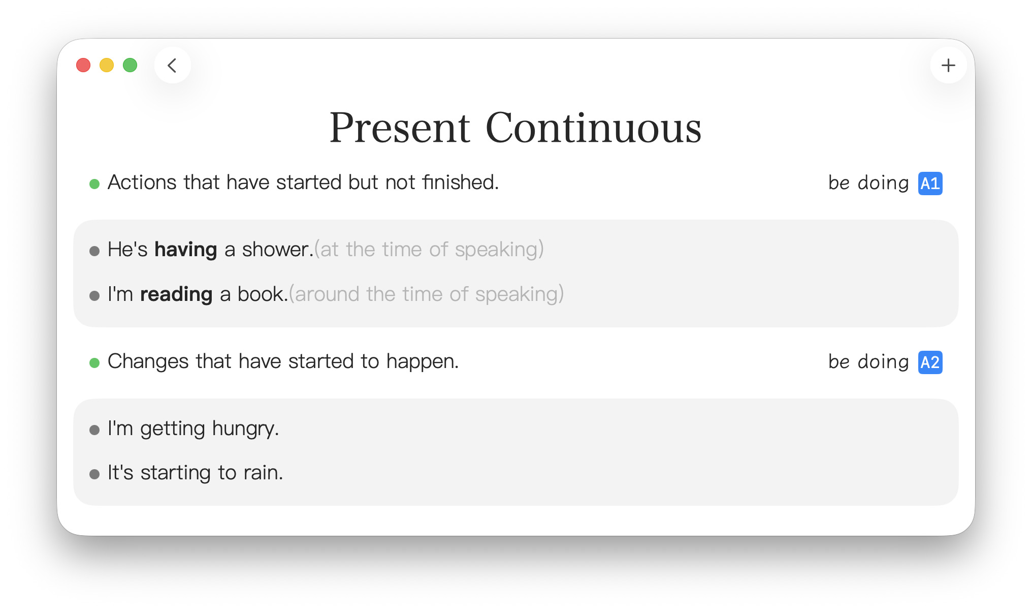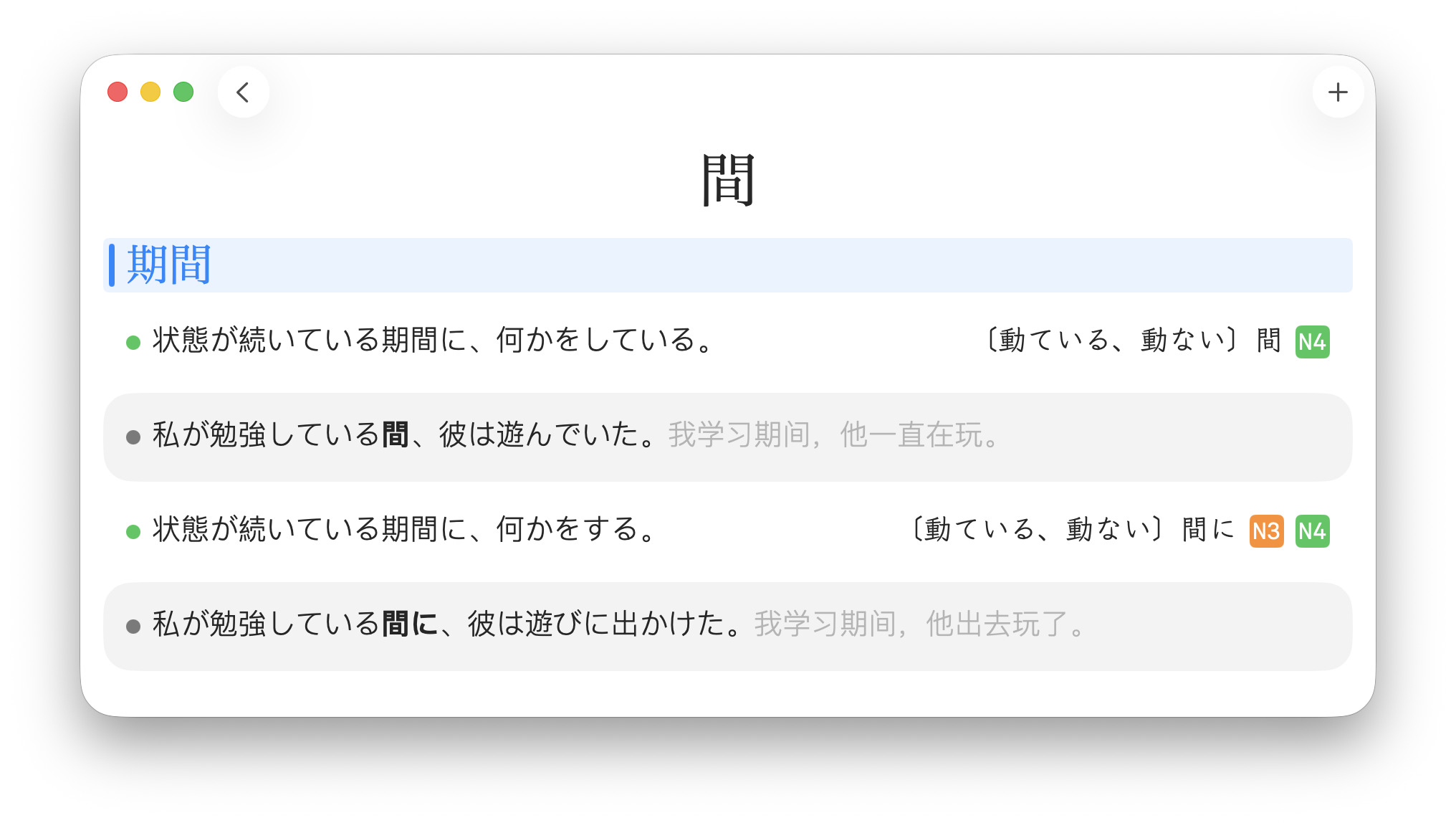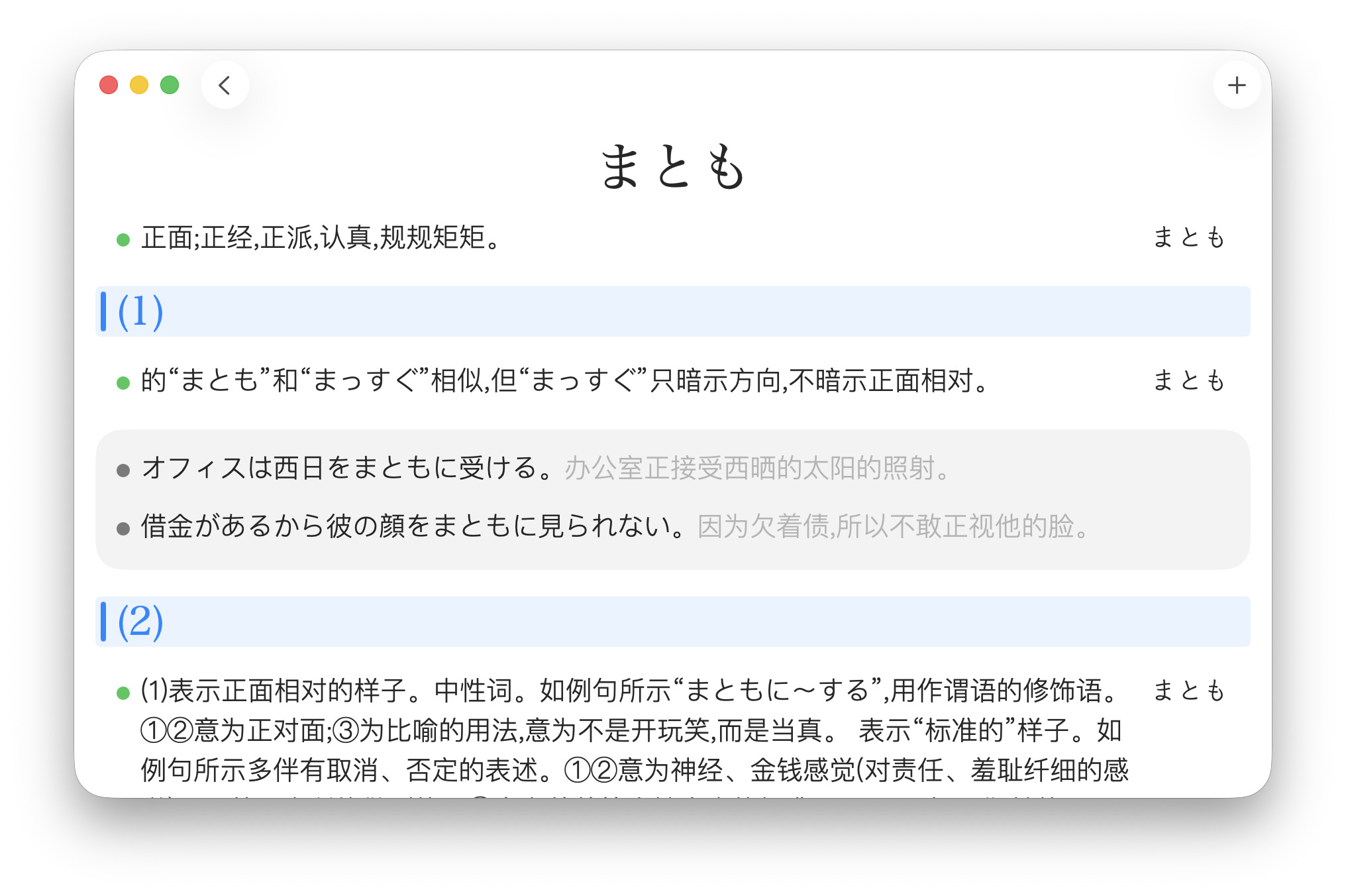 点击进入详情页,主要是用来记录日语语法的,单词或英语语法也能用。绿点代表一个意思,灰点代表例子,蓝色横幅表示类似的释义。